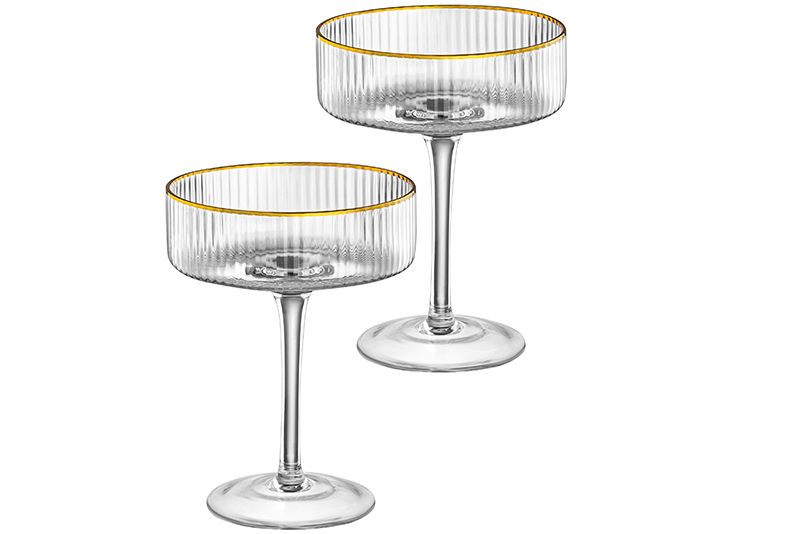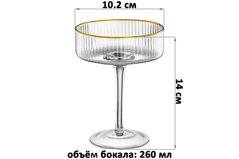 Набор прозрачных бокалов для шампанского (креманок) от бренда Elan Gallery выполнен из стекла, состоит из 2 предметов. Размер каждого – 10,2х10,2х14 см, объём – 260 мл. Диаметр горлышка – 10,2 см, диаметр дна – 7,5 см. Изящная форма и золотое окаймление позволят фужерам украсить ваш стол не только в будни, но и на праздник. Имеют высокие тонкие ножки, что добавляет им элегантности. Наслаждайтесь красным вином, шампанским и другими алкогольными и безалкогольными напитками из стильных стеклянных бокалов с золотистой каймой и аккуратным полосатым рельефом! Подходят также для игристого вина, мартини и лимонада. Этот набор станет неотъемлемой частью свадебной или новогодней сервировки стола, создавая праздничное настроение. Налейте в бокалы на ножках сок, коктейль и наслаждайтесь любимыми напитками в кругу близких и друзей. Они станут незаменимой вещью для девичников и вечеринок. Не рекомендуется применять абразивные моющие средства. Нельзя использовать в микроволновой печи и посудомоечной машине. Упакованы в картонную коробку. Красивая посуда – отличный подарок на любой праздник и незаменимая принадлежность для домашнего бара. Благодаря комплекту стаканов для шампанского вы сможете создать особенную атмосферу в любой день, а также без труда устроить романтический вечер у себя дома. В коллекции бренда Элан Галерея представлено много товаров для дома и кухонного инвентаря, в том числе винных стаканов. Выберите варианты на свой вкус!