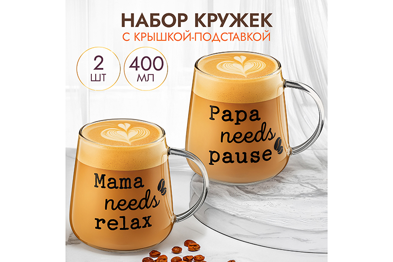 Набор 2 кружек из серии Crystal glass от Elan Gallery предназначен для эстетичной сервировки вашего стола. Размер каждой ёмкости – 10,6х9х9,6 см, объём – 400 мл. Выполнены из термостойкого боросиликатного стекла. Жаропрочный материал выдерживает от -20 °C до +150 °C и позволит наслаждаться напитками любой температуры. Не имеет в составе вредных веществ, не впитывает запахи и вкусы. Прозрачную поверхность изделий украшают декоративные надписи «Mama needs relax» («Маме надо расслабиться») и «Papa needs pause» («Папе нужна пауза»). Кофейные кружки помогут провести множество приятных завтраков с капучино и латте, а также уютные чайные вечера с конфетами, вафлями и другими десертами и сладостями. Подойдут ценителям чая и кофе, которые любят пить из красивой и необычной посуды. Согрейтесь зимой любимым напитком: какао с маршмэллоу, ягодным чаем или горячим шоколадом. Летом освежитесь домашним лимонадом или морсом. Парные кружки станут идеальным дополнением романтического чаепития или уютного семейного ужина. Не рекомендуется применять абразивные моющие средства. Подходят для использования в микроволновой печи. Не подходят для посудомоечной машины. Поставляются в дизайнерской картонной коробке – благодаря ей вам не потребуется дополнительная подарочная упаковка. В серии Crystal glass можно найти много разнообразных кувшинов и графинов, которые подходят для горячей жидкости. Красивая посуда, кухонный инвентарь и товары для дома от бренда Элан Галерея позволят создать уют на вашей кухне или в столовой!