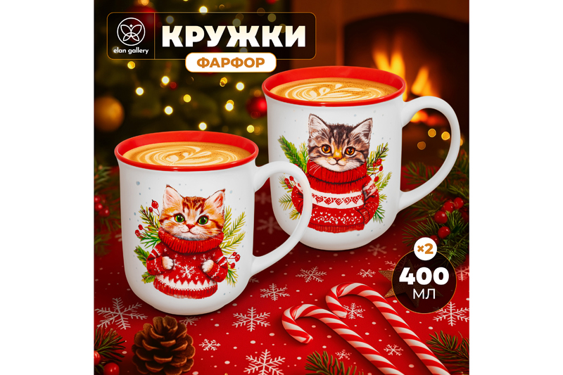 Набор 2 кружек от бренда Elan Gallery "Зимние котята" выполнен из фарфора. Размер каждого изделия 12х9х10 см, объём – 400 мл. Посуда красно-белого цвета украшена изображениями забавных котят в тёплых зимних свитерах. Пейте любимые напитки в компании с нарядными котиками и наслаждайтесь тёплой и уютной атмосферой. Пусть ваш день наполнится радостью и заставит мурчать от удовольствия! Кружечки с красочными рисунками помогут провести множество приятных завтраков с капучино или латте, а также уютных чайных вечеров с любимым горячим напитком. Белые бокалы окрашены внутри красным цветом и имеют контрастное окаймление, что придаёт им праздничный вид. Они подходят ценителям чая и кофе, которые любят пить из красивой посуды. Фарфоровое изделие с принтом отлично подойдёт как для молока, так свежевыжатого сока и морса. Гладкие фарфоровые стеночки в отличие от керамических быстро отмываются и не впитывают цвет напитков. Кружки со стильным дизайном украсят интерьер кухни или столовой. Подойдут как женщине, так и мужчине для кофейных перерывов на работе в офисе. Можно использовать как парные. Не рекомендуется применять абразивные моющие средства. Подходят для микроволновой печи и посудомоечной машины. Набор поставляется в стильной картонной коробке. Благодаря красочной коробочке вам не понадобится дополнительная подарочная упаковка. Станет приятным подарком на любой праздник, в том числе Новый год и Рождество. Подарите фарфоровую кружку детям или коллеге, чтобы выразить свои тёплые чувства. Особенно понравится хозяевам домашних животных, которые узнают в сером или рыжем коте своего питомца. В коллекции бренда Элан Галерея представлено много кухонного инвентаря, сувениров и товаров для дома, в том числе бокалов и красивых чашек. Сделайте перерыв на мечты и насладитесь любимыми напитками из кружек со стильным дизайном!