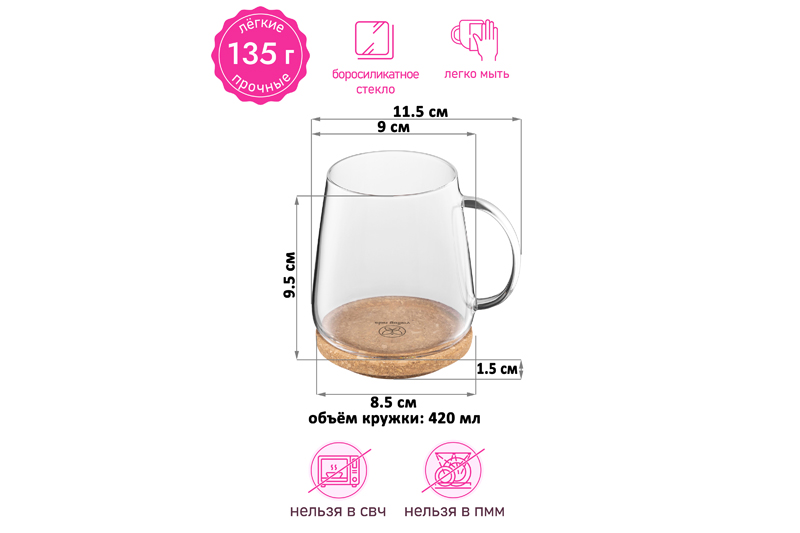 Набор из 2-х кружек Crystal glass по 420 мл поможет провести множество уютных чаепитий или приятных завтраков с любимым кофе. Имеют в комплекте пробковые крышки, которые можно использовать как подставки. Набор выполнен из термостойкого боросиликатного стекла. Стильные чашки смогут стать чайным или кофейным набором на 2 персоны. Подходят как для холодных, так и горячих напитков: воды, лимонада, коктейлей, чая, эспрессо, капучино, латте, глинтвейна. Напитки в прозрачных кружках выглядят яркими и красивыми. Набор поможет организовать эстетичную сервировку стола. Без подставок стеклянные жаропрочные кружки подходят для использования в СВЧ (микроволновой печи) и ПММ (посудомоечной машине). Комплект поставляется в стильной картонной упаковке. Необычные кружки из серии посуды Crystal glass смогут стать настоящим украшением кухни и дома или приятным подарком для ваших родных и близких.