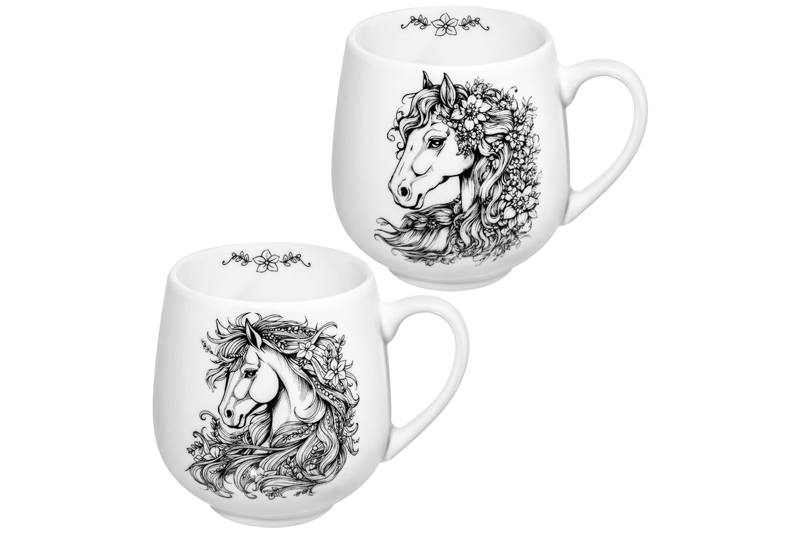 Набор 2 кружек от бренда Elan Gallery "Лошадки" выполнен из фарфора. Размер каждого изделия 13,5х10,5х10,7 см, объём – 530 мл. Дизайн вдохновлён грацией и красотой самого благородного животного на планете – лошади. Кружечки украшены чёрно-белыми изображениями грациозных лошадей с цветами в пышных гривах. Они помогут провести множество приятных завтраков с капучино или латте, а также уютных чайных вечеров с любимым горячим напитком. Белые бокалы с изящными рисунками чёрного цвета имеют оригинальную форму бочонка. Они подходят ценителям чая и кофе, которые любят пить из красивой посуды. Фарфоровое изделие с принтом отлично подойдёт как для молока, так свежевыжатого сока и морса. Гладкие фарфоровые стеночки в отличие от керамических быстро отмываются и не впитывают цвет напитков. Кружки со стильным дизайном украсят интерьер кухни или столовой. Подойдут как женщине, так и мужчине для кофейных перерывов на работе в офисе. Можно использовать как парные. Не рекомендуется применять абразивные моющие средства. Подходят для микроволновой печи и посудомоечной машины. Набор поставляется в стильной картонной коробке. Благодаря красочной коробочке вам не понадобится дополнительная подарочная упаковка. Станет приятным подарком на праздник. Подарите фарфоровую кружку близким или коллеге, чтобы выразить свои тёплые чувства. Особенно понравится любителям лошадок, а также ценителям эстетичных и оригинальных вещей. В коллекции бренда Элан Галерея представлено много кухонного инвентаря, сувениров и товаров для дома, в том числе бокалов и красивых чашек. Сделайте перерыв на мечты и насладитесь любимыми напитками из кружек со стильным дизайном!