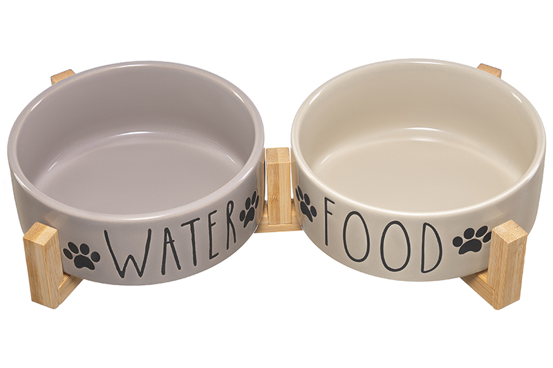 Набор 2 мисок для домашних питомцев 450 мл 28*14,5*6,5 см, с бамбуковой подставкой, бежевый/серый
