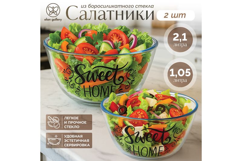 Набор 2 салатников от бренда Elan Gallery из серии "Crystal glass" – это идеальное решение для любителей здорового питания и красивой сервировки кухонного стола. Комплект включает в себя глубокие тарелки нескольких размеров, что позволяет выбирать наиболее подходящий вариант для каждого блюда. В комплект входят следующие сервировочные ёмкости: одна объёмом 1,05 литра и размером 17х17х9 см, вторая – объёмом 2,1 литра и размером 21х21х10,5 см. Салатницы изготовлены из боросиликатного стекла. Материал устойчив к высоким температурам, не выделяет вредных веществ, а также не впитывает вкус и запах продуктов. В стеклянных мисках вы можете приготовить различные блюда, а также подавать горячие салаты, закуски, нарезки фруктов или десерты. Набор жаропрочных салатников имеет универсальный, но при этом стильный внешний вид, поэтому легко вписывается в любой интерьер. Каждая форма украшена надписью "Sweet home" ("Милый дом"). При уходе не рекомендуется применять абразивные моющие средства. Эта посуда устойчива к высоким температурам, поэтому подходит для использования в микроволновой печи. Избегать резких перепадов температур и механических повреждений! Не рекомендуется мыть в посудомоечной машине. Комплект посуды не занимает много места, так как каждый салатник можно хранить друг в друге. Набор послужит отличным подарком для ценителей функциональных кухонных принадлежностей и эстетичных вещей. Поставляется в стильной коробке. Благодаря красочной коробочке не понадобится подарочная упаковка, если вы решите преподнести кому-нибудь сюрприз. В коллекции бренда Элан Галерея представлено много стильных товаров для дома, выберите вариант на свой вкус!