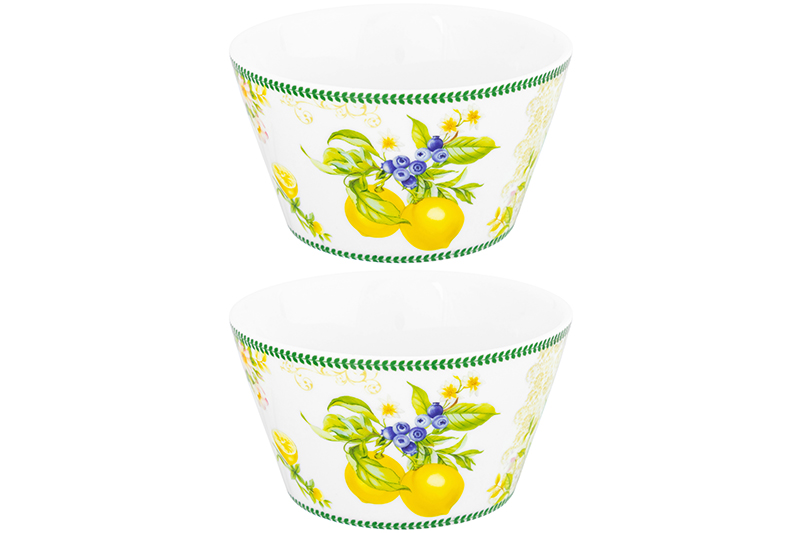 Набор 2 салатников из серии «Лимоны» предназначен для подачи угощений и закусок. Размер каждого изделия – 13х13х7,5 см, объём – 600 мл. Выполнены из фарфора нового поколения new bone china, сочетающего в себе изящность и высокую прочность. За счёт гладкости изделия легко отмываются, поэтому долго сохраняют привлекательный вид и практичны в использовании. Плотная структура материала позволяет посуде дольше сохранять температуру блюд и напитков. От других видов костяного фарфора new bone china отличается большей экологичностью в производстве. Фарфоровая посуда с ярким рисунком в виде лимонов станет изящным дополнением интерьера любой кухни или столовой. Используйте глубокие тарелки для красивой подачи любых салатов на ваш вкус, а также овощей, фруктов или ягод. Заполните их мясной и сырной нарезкой и украсьте свежей зеленью. Отлично послужат в качестве конфетниц – сложите в них любимые сладости или печенье. Не рекомендуется применять абразивные моющие средства. Подходит для использования в посудомоечной машине и микроволновой печи. Поставляется в красивой картонной коробке – благодаря ей вам не потребуется дополнительная подарочная упаковка. Набор станет оригинальным подарком для любой хозяйки и незаменимым элементом сервировочного инвентаря в вашем доме!
