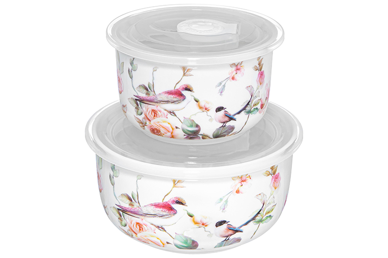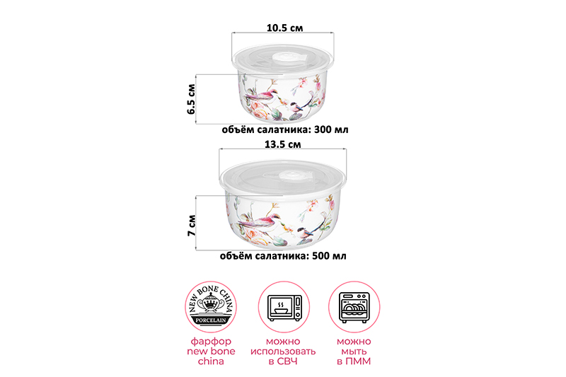 Набор 2 салатников 500 мл 13,5*13,5*7 см + 300 мл 10,5*10,5*6,5 см "Певчие птички" с крышк. NEW BONE