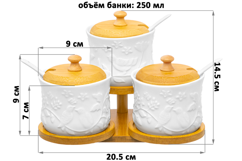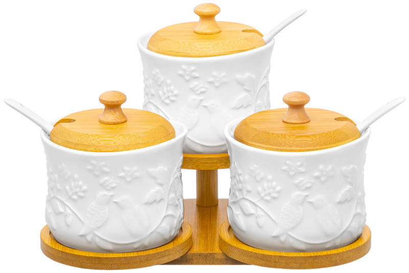 Набор 3 банок д/хранения 250 мл 20,5*17,5*14,5 см "Птички на ветке" на дер. подставке + 3 ложки