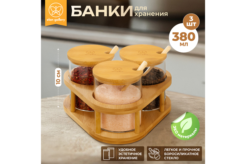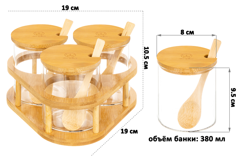Набор серии Crystal glass состоит из 3-х стеклянных банок объемом по 380 мл на бамбуковой подставке. Оснащены крышками и ложками. Баночки выполнены из боросиликатного стекла. Такие контейнеры подойдут для хранения самых разных сыпучих продуктов и круп, муки, сахара, приправ или разных мелочей. Стильные баночки подойдут к большому количеству самой разной посуды и будут с ней хорошо сочетаться. Можно использовать как набор для специй с сахарницей, солонкой и перечницей. Размер набора 19х19х10,5 см. Размеры емкостей по 8х8х9,5 см. Банки без бамбуковых деталей можно использовать в СВЧ и ПММ. Бамбуковые детали нельзя замачивать. Набор поставляется в стильной картонной упаковке. Банки из серии посуды Crystal glass смогут стать удобным и эстетичным дополнением вашего дома!