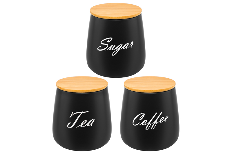 Набор 3 банок для хранения от Elan Gallery послужит в качестве органайзера на вашей кухне. Размер каждой ёмкости – 12х12х13 см, объём – 850 мл. Выполнены из керамики, их чёрная матовая поверхность украшена каллиграфическими надписями «Tea» («Чай»), «Coffee» («Кофе»), «Sugar» («Сахар»). Крышки выполнены из натурального бамбука и оснащены силиконовым уплотнителем. Баночки имеют мягкую, изящную округлую форму. Изделия отлично подойдут для разнообразных сыпучих продуктов: чая, кофе, сахара и соли, приправ и специй. Храните в них крупы и макароны, а также ягоды, орехи и сухофрукты. Заполните их сладостями: конфетами, леденцами, пряниками или печеньем. Подайте каждую баночку к столу, чтобы идеально дополнить чайную сервировку! Герметичные бамбуковые крышечки защитят ваши продукты от рассыпания, попадания грязи и пыли. Не рекомендуется применять абразивные моющие средства. Не подходят для использования в микроволновой печи. Без крышки подходят для посудомоечной машины. Бамбук нельзя замачивать! Поставляются в дизайнерской картонной коробке – благодаря ей вам не потребуется дополнительная подарочная упаковка. Баночки станут идеальным подарком для хозяйки, ценящей не только практичность, но и стиль. Набор кухонных контейнеров от бренда Элан Галерея создаст на кухне уют домашней атмосферы и подчеркнёт вашу оригинальность!