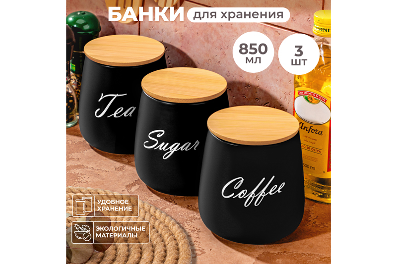 Набор 3 банок д/хранения 850 мл 12*12*13 см "Tea, Coffe, Sugar" с бамбук. крышк.черный матовый