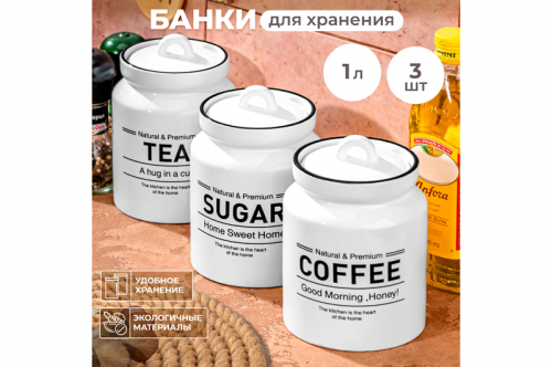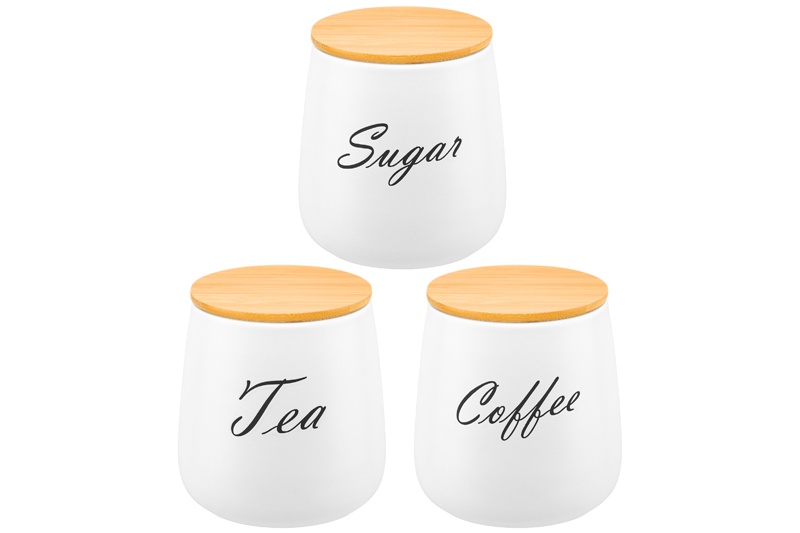 Набор 3 банок для хранения послужит в качестве органайзера на вашей кухне. Размер каждой ёмкости – 12х12х13 см, объём – 850 мл. Выполнены из керамики, их белая матовая поверхность украшена каллиграфическими надписями «Tea» («Чай»), «Coffee» («Кофе»), «Sugar» («Сахар»). Крышки выполнены из натурального бамбука и оснащены силиконовым уплотнителем. Баночки имеют мягкую, изящную округлую форму. Изделия отлично подойдут для разнообразных сыпучих продуктов: чая, кофе, сахара и соли, приправ и специй. Храните в них крупы и макароны, а также ягоды, орехи и сухофрукты. Заполните их сладостями: конфетами, леденцами, пряниками или печеньем. Подайте каждую баночку к столу, чтобы идеально дополнить чайную сервировку! Герметичные бамбуковые крышечки защитят ваши продукты от рассыпания, попадания грязи и пыли. Не рекомендуется применять абразивные моющие средства. Не подходят для использования в микроволновой печи. Без крышки подходят для посудомоечной машины. Бамбук нельзя замачивать! Поставляются в дизайнерской картонной коробке – благодаря ей вам не потребуется дополнительная подарочная упаковка. Баночки станут идеальным подарком для хозяйки, ценящей не только практичность, но и стиль. Набор кухонных контейнеров от бренда Элан Галерея создаст на кухне уют домашней атмосферы и подчеркнёт вашу оригинальность!