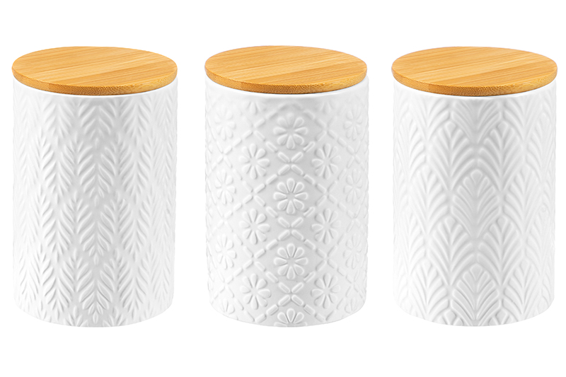 Набор 3 банок для сыпучих продуктов с бамбуковыми крышками от бренда Elan Gallery по 700 мл станет удобным и эстетичным дополнением вашей кухни. Размер каждого изделия – 10х10х15 см, высота каждой банки без крышки – 14,3 см. Круглые ёмкости белого цвета выполнены из керамики и плотно закрываются бамбуковыми крышками благодаря силиконовому уплотнителю. Керамические ёмкости позволят красиво хранить продукты на полке или в шкафу. Благодаря стильному дизайну подходят для эстетичного хранения на столе, а также для сервировки. Каждая банка украшена рельефным узором с изображением листиков и цветочков. Комплект трёх контейнеров позволит не просто хранить чай, кофе и сахар на вашей кухне, но и станет элементом её декора. Кухонные баночки для сыпучих продуктов подойдут к интерьеру в любом стиле, от скандинавского до лофт. Не рекомендуется применять абразивные моющие средства. Без крышки можно мыть в посудомоечной машине. Бамбук нельзя замачивать. Поставляются в стильной картонной коробке. Набор посуды из 3 предметов станет украшением кухни или приятным подарком на любой праздник. Благодаря красочной коробочке не потребуется подарочная упаковка. В коллекции бренда Элан Галерея представлено много кухонных органайзеров, сахарниц, столового инвентаря и других стильных товаров для дома. Выберите вариант на свой вкус.
