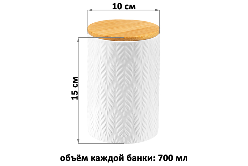 Набор 3 банок для сыпучих продуктов с бамбуковыми крышками от бренда Elan Gallery по 700 мл станет удобным и эстетичным дополнением вашей кухни. Размер каждого изделия – 10х10х15 см, высота каждой банки без крышки – 14,3 см. Круглые ёмкости белого цвета выполнены из керамики и плотно закрываются бамбуковыми крышками благодаря силиконовому уплотнителю. Керамические ёмкости позволят красиво хранить продукты на полке или в шкафу. Благодаря стильному дизайну подходят для эстетичного хранения на столе, а также для сервировки. Каждая банка украшена рельефным узором с изображением листиков и цветочков. Комплект трёх контейнеров позволит не просто хранить чай, кофе и сахар на вашей кухне, но и станет элементом её декора. Кухонные баночки для сыпучих продуктов подойдут к интерьеру в любом стиле, от скандинавского до лофт. Не рекомендуется применять абразивные моющие средства. Без крышки можно мыть в посудомоечной машине. Бамбук нельзя замачивать. Поставляются в стильной картонной коробке. Набор посуды из 3 предметов станет украшением кухни или приятным подарком на любой праздник. Благодаря красочной коробочке не потребуется подарочная упаковка. В коллекции бренда Элан Галерея представлено много кухонных органайзеров, сахарниц, столового инвентаря и других стильных товаров для дома. Выберите вариант на свой вкус.