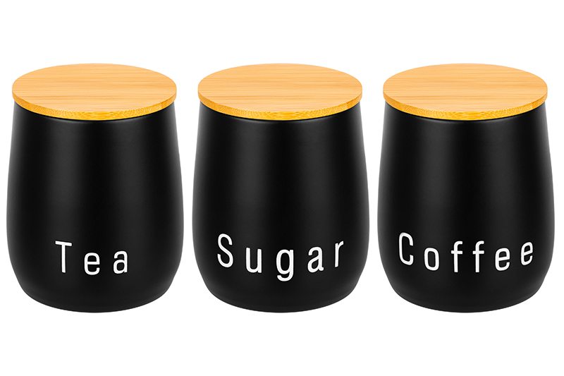 Набор 3 банок для сыпучих продуктов с бамбуковыми крышками от бренда Elan Gallery по 850 мл (каждая) станет удобным и эстетичным дополнением вашей кухни. Размер каждого изделия – 10,5х10,5х12,5 см, высота каждой банки без крышки – 12 см. Круглые ёмкости чёрного цвета выполнены из металла и плотно закрываются бамбуковыми крышками благодаря силиконовому уплотнителю. Ёмкости позволят красиво хранить продукты на полке или в шкафу. Благодаря стильному дизайну подходят для эстетичного хранения на столе, а также для сервировки. Каждая металлическая банка украшена надписью: "Tea"("Чай"), "Coffee"("Кофе"), "Sugar"("Сахар"). Комплект трёх контейнеров позволит не просто хранить чай, кофе и сахар на вашей кухне, но и станет элементом её декора. Кухонные баночки для сыпучих продуктов подойдут к интерьеру в любом стиле, от скандинавского до лофт. Не рекомендуется применять абразивные моющие средства. Нельзя использовать в микроволновой печи и посудомоечной машине. Бамбук нельзя замачивать. Поставляются в стильной картонной коробке. Набор посуды из 3 предметов станет украшением кухни или приятным подарком на любой праздник. Благодаря красочной коробочке не потребуется подарочная упаковка. В коллекции бренда Элан Галерея представлено много кухонных органайзеров, сахарниц, столового инвентаря и других стильных товаров для дома. Выберите вариант на свой вкус.
