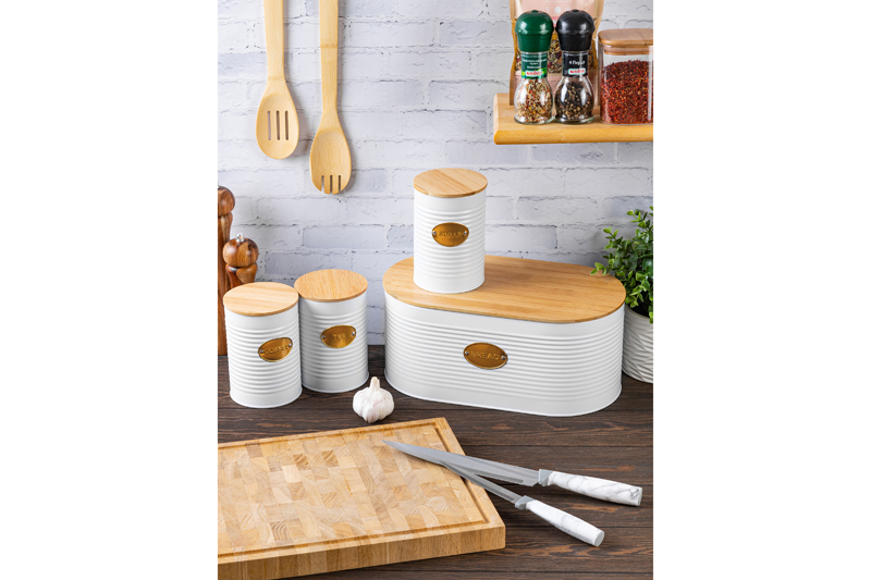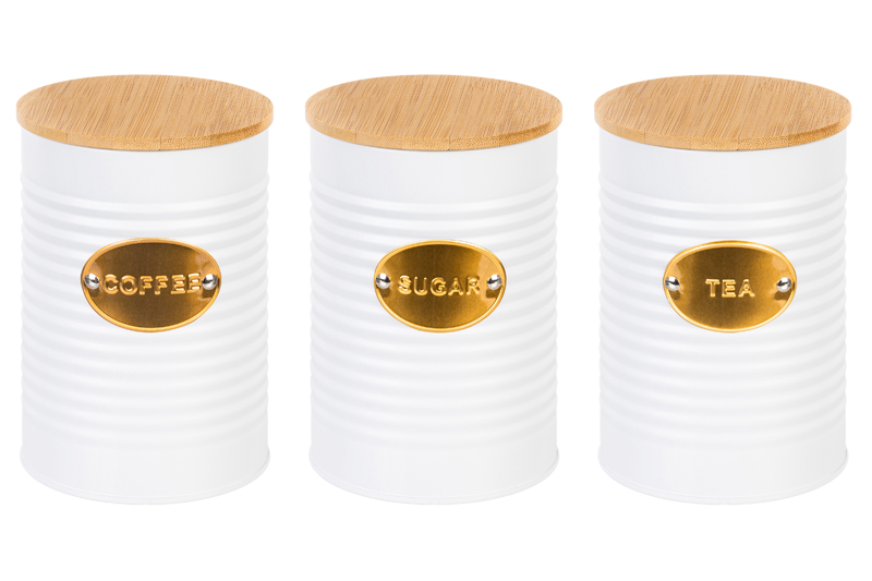 Набор 3 банок от Elan Gallery предназначен для организации системы хранения продуктов на вашей кухне. Размер каждой ёмкости – 10х10х14,5 см, объём – 900 мл. Белые банки выполнены из металла с пудровым покрытием. На их рельефные стенки нанесены золотые плашки с надписями: «coffee» («кофе»), «sugar» («сахар»), «tea» («чай»). Крышки выполнены из натурального бамбука. Используйте органайзеры для хранения разнообразных сыпучих продуктов: чая и кофе, сахара и соли, специй и приправ, круп и макаронных изделий. Заполните баночки сухофруктами, печеньем, конфетами и другими поштучными сладостями. Ёмкости не впитывают запахи, а герметичные крышки защитят продукты от влаги и пыли. Стильные контейнеры станут не только функциональным, но и эстетичным дополнением вашей кухни. Их лаконичный дизайн впишется в интерьер любой столовой. Не рекомендуется применять абразивные моющие средства. Не подходят для использования в посудомоечной машине и микроволновой печи. Бамбук нельзя замачивать! Поставляются в дизайнерской картонной коробке – благодаря ей вам не потребуется дополнительная подарочная упаковка. Набор от бренда Элан Галерея поможет вам привнести эстетику в свой кухонный инвентарь и организовать удобное хранение продуктов!