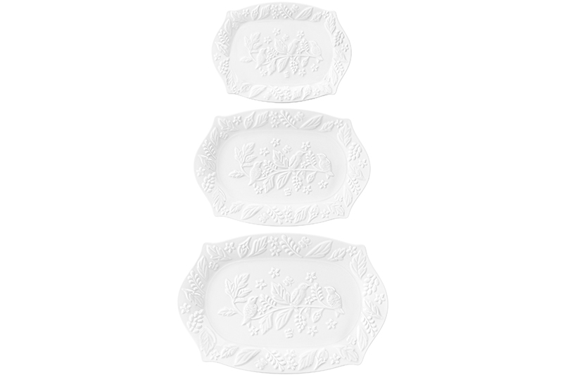 Набор 3 фигурных блюд «Птички на ветке» предназначен для эстетичной сервировки стола. В него входят блюда разного размера: первое – 30,5х20,5х2,5 см, второе – 25,5х17,5х2 см, третье – 20,5х14,5х2 см. Изделия выполнены из высококачественного белого фарфора и украшены рельефным узором. Фарфор легко отмывается и не впитывает цвет продуктов. Используйте посуду для необычной подачи салатов, горячих и холодных угощений, закусок, сладостей и десертов. Положите в них сырную нарезку или кусочки ветчины и украсьте свежей зеленью. Красивые тарелочки отлично подойдут для подачи конфет и фруктов. Набор позволит оформить стол самыми разнообразными угощениями. Не рекомендуется применять абразивные моющие средства. Подойдут для использования в микроволновой печи и посудомоечной машине. Поставляются в стильной картонной упаковке. Декоративные тарелки нестандартной формы станут превосходным подарком и отлично дополнят ваш кухонный сервиз! Обновите свою кухню изысканной фарфоровой посудой.