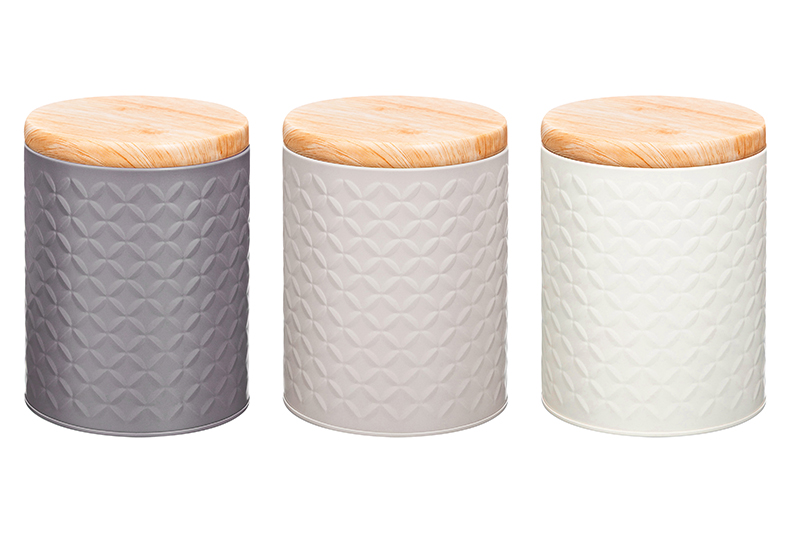 Набор 3 банок для хранения с металлическими крышками от бренда Elan Gallery по 900 мл станет удобным дополнением вашей кухни. В комплект входят высокие баночки в стильной палитре белого, светло-серого и тёмно-серого цветов. Размер каждой – 10,5х10,5х13,8 см. Металлические крышки имеют необычный дизайн: рисунок имитирует деревянную поверхность. Благодаря реалистичному изображению на поверхности крышка сочетает прочность металла с природной эстетикой. Она плотно фиксируется на банке за счёт своей формы: вставляется внутрь по принципу пробки. Основание крышечки, которое вставляется в банку, тоже металлическое. Такая модель крышки обеспечивает плотное прилегание и не нуждается в дополнительных уплотнителях. Круглые ёмкости выполнены из металла с пудровым покрытием и украшены геометрическими рельефными узорами в форме ромбиков. Стеночка каждого ромбика на узоре напоминает узкий выпуклый листочек. Металлические ёмкости позволят красиво хранить сыпучие продукты на полке или в шкафу. Понравятся любителям жестяных банок, так как данные контейнеры из металла тоже достаточно лёгкие по весу. Благодаря стильному дизайну подходят для эстетичного хранения на столе, а также для сервировки конфет, печенья и других сладостей. Комплект трёх контейнеров позволит не просто хранить чай, кофе и сахар на вашей кухне, но и станет элементом её декора. Кухонные баночки подойдут к интерьеру в любом стиле и обеспечат удобный доступ к крупам, соли или макаронам. Не рекомендуется применять абразивные моющие средства. Нельзя использовать в микроволновой печи и посудомоечной машине. Поставляются в стильной картонной коробке. Набор посуды из 3 предметов станет украшением кухни или приятным подарком на любой праздник. Благодаря красочной коробочке не потребуется подарочная упаковка. В коллекции бренда Элан Галерея представлено много кухонных органайзеров, сахарниц, столового инвентаря и других стильных товаров для дома. Выберите вариант на свой вкус.