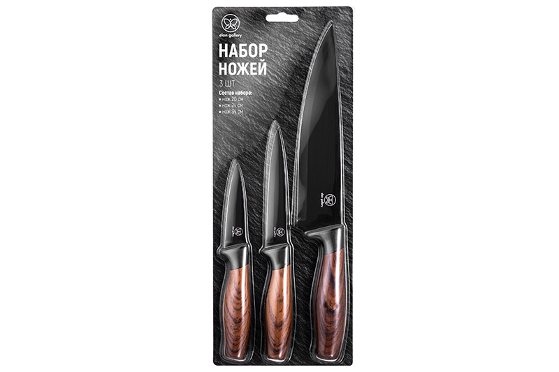 Набор Elan Gallery "Дерево" состоит из трёх ножей разной длины. В комплект входят: овощной нож размером 19,5х2х2,8 см (длина клинка – 8,6 см, длина рукоятки – 11,3 см, толщина рукоятки – 2 см), универсальный нож размером 23,5х2х2,8 см (длина клинка – 12,25 см, длина рукоятки – 11,3 см, толщина рукоятки – 2 см), поварской шеф-нож размером 33х2,5х4,6 см (длина клинка – 19,6 см, длина рукоятки – 12,8 см, толщина рукоятки – 2,5 см). Этот набор станет незаменимым помощником в процессе готовки и отлично справится с разделкой мяса или рыбы. Каждый нож имеет коричневую ручку из пластика и острое лезвие из нержавеющей стали с логотипом бренда. Рукоятки выполнены в дизайне, имитирующим дерево. Это универсальные кухонные принадлежности. Их можно использовать как овощные, мясные или хлебные ножи. Маленький ножик подходит для резки мелких продуктов: овощей, фруктов или зелени. Его острое лезвие позволяет производить точные и аккуратные надрезы. Средний нож подойдет для нарезки колбасы, сыра или хлеба. Благодаря длинному лезвию нож позволяет резать продукты легко и без усилий. Большой поварской нож можно использовать для нарезки картофеля, рыбы, мяса или шинковки капусты. Удобная рукоятка обеспечивает комфортную работу с ножом. Эти универсальные кухонные принадлежности удобны в использовании как мужчинами, так и женщинами. Набор ножей с лезвиями из нержавеющей стали станет настоящим помощником для профессионального повара. Подходят для мытья в посудомоечной машине. Этот набор станет незаменимым инвентарём на вашей кухне и поможет в приготовлении множества вкусных блюд!