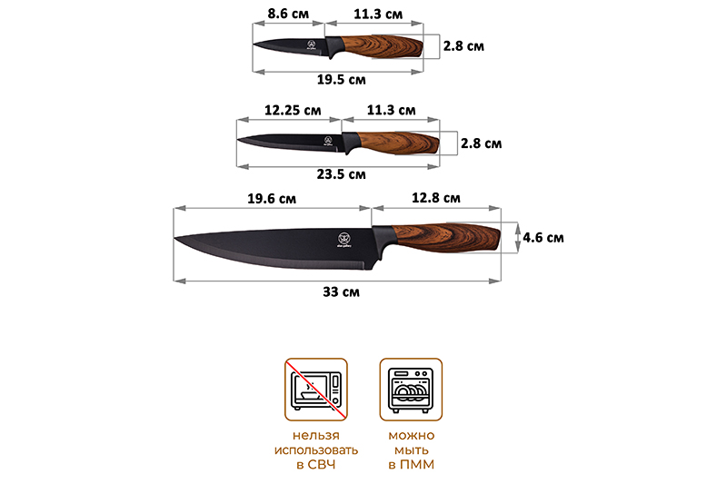Набор 3 ножей 19,5*2*2,8 см + 23,5*2*2,8 см + 33*2,5*4,6 см "Дерево"