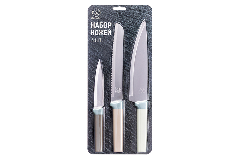 Набор 3 ножей от Elan Gallery станет стильным и функциональным дополнением вашей кухни. В комплект входят ножи разных размеров: овощной – 23х1,3х2,5 см (длина клинка 12 см), хлебный – 32,5х1,5х3 см (длина клинка 20 см), поварской шеф-нож – 33х1,5х4,5 см (длина клинка 20,5 см). Лезвия выполнены из нержавеющей стали, ручки – из полипропилена. Это прочный пищевой пластик, не содержащий бисфенол А и другие вредные вещества. Ручки окрашены в сдержанные пастельные цвета, благодаря которым ножики лаконично впишутся в интерьер любой кухни. Универсальный набор подойдёт для повседневной готовки и эстетичной сервировки стола. Овощной нож поможет аккуратно нарезать фрукты и овощи для салатов. Хлебный нож поможет с нарезкой батонов и багетов на завтрак. С его помощью вы легко разделите праздничные торты и пироги на равные дольки. Шеф-нож справится с разделкой рыбы и мяса, с измельчением картофеля и шинковкой капусты. Острые стальные лезвия обеспечат точность и комфорт при резке, а удобные рукоятки с мягкой текстурой комфортно сидят в руке и приятны на ощупь. Не рекомендуется применять абразивные моющие средства. Не подходят для использования в микроволновой печи. Подходят для использования в посудомоечной машине. Поставляются в дизайнерской блистерной упаковке. Набор ножей от бренда Элан Галерея оценят как профессиональные повара, так и любители домашней кухни. Он послужит отличным подарком для ваших родных и близких. Качественные и эстетичные изделия сделают процесс готовки приятнее, став практичным дополнением вашего кухонного инвентаря!