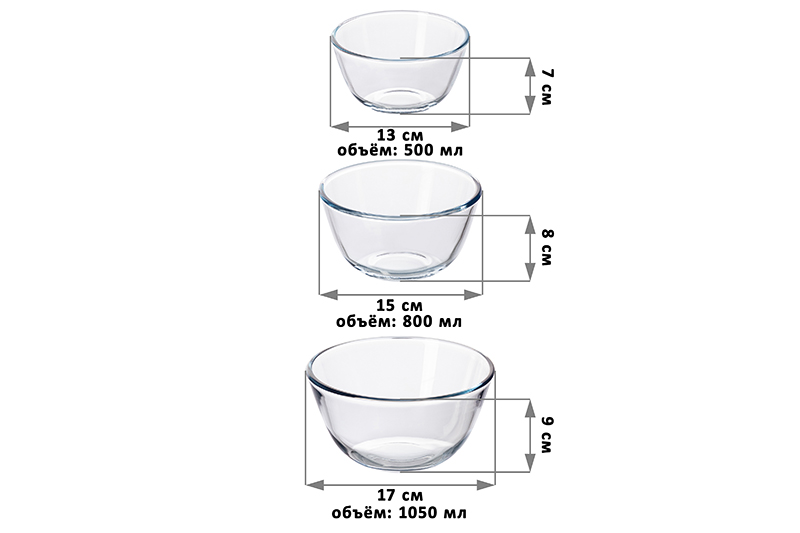 Набор из 3-х салатников — это идеальное решение для любителей здорового питания и красивой сервировки кухонного стола. Набор включает в себя глубокие салатники нескольких размеров, что позволяет выбирать наиболее подходящий для каждого блюда. В комплект входят ёмкости объёмами 500 мл, 800 мл и 1050 мл. Салатники изготовлены из высококачественного жаропрочного стекла. Продукты в такой посуде даже после тепловой обработки сохраняют полезные свойства. В салатниках вы можете не только приготовить различные блюда, но и подавать горячие салаты, закуски, нарезки фруктов или десерты. Набор салатников имеет красивый внешний вид и легко вписывается в любой интерьер. При уходе не рекомендуется применять абразивные моющие средства. Эта посуда устойчива к высоким температурам, поэтому подходит для использования в СВЧ и ПММ. Комплект посуды не занимает много места, так как каждый салатник можно хранить друг в друге. Набор салатников послужит отличным подарком для ценителей функциональных кухонных принадлежностей.
