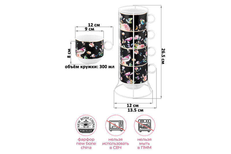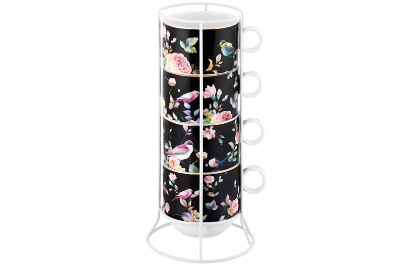 Набор 4 кружек из серии «Певчие птички» от Elan Gallery предназначен для эстетичной сервировки вашего стола. Размер каждой ёмкости – 12х9х8 см, объём – 300 мл. Изготовлены из фарфора нового поколения new bone china, сочетающего в себе изящность и высокую прочность. За счёт гладкости изделия легко отмываются, поэтому сохраняют привлекательный внешний вид и практичны в использовании. Плотная структура материала позволяет посуде дольше сохранять температуру блюд и напитков. От других видов костяного фарфора new bone china отличается большей экологичностью в производстве. Чёрная поверхность изделий украшена рисунком пёстрых птичек и пышных бутонов роз. Они выполнены в манере, вдохновлённой акварельным рисунком. Тонкая золотистая окантовка служит деликатным акцентом и подчёркивает их изысканность. Размер подставки – 12х12х26,5 см. Изготовлена из металла в лаконичном белом цвете. Декоративные кофейные кружечки помогут провести множество приятных завтраков с капучино и латте, а также уютные чайные вечера с конфетами, вафлями, другими десертами и сладостями. Подойдут ценителям чая и кофе, которые любят пить из красивой и необычной посуды. Согрейтесь зимой любимым напитком: какао с маршмэллоу, ягодным чаем или горячим шоколадом. Летом освежитесь домашним лимонадом или морсом. Чашки помогут организовать запоминающееся чаепитие в большой компании. Благодаря металлической подставке и штабелируемому формату кружечек вы сможете компактно хранить комплект. Не рекомендуется применять абразивные моющие средства. Набор не подходит для использования в посудомоечной машине и микроволновой печи. Поставляется в дизайнерской картонной коробке – благодаря ей вам не потребуется дополнительная подарочная упаковка. Фарфоровая сервировочная посуда будет оригинальным подарком для хозяйки, ценящей не только практичность, но и привлекательность. Серия «Певчие птички» от бренда Элан Галерея добавит вашему кухонному инвентарю лёгкости и элегантности, преобразив любую сервировку!