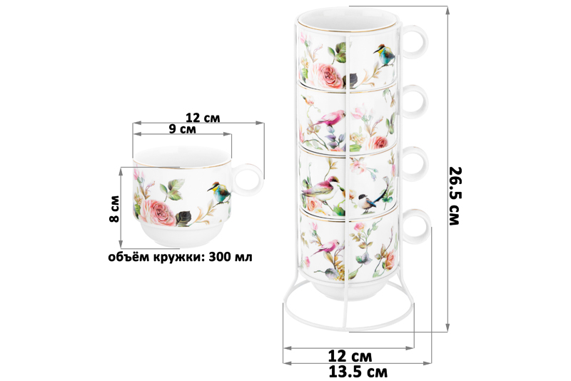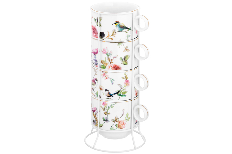 Набор 4 кружек 300 мл 12*9*8 см "Певчие птички" на металлической подставке, NEW BONE CHINA