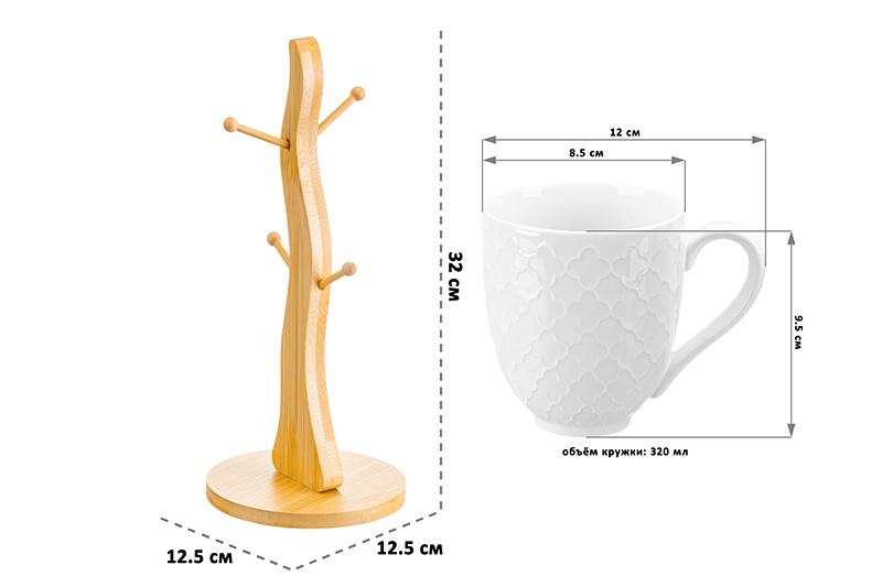 Набор состоит из 4 кружек серии «Арабеск» объемом по 320 мл на подставке из бамбука. Размер каждой кружки – 12х8,5х9,5 см. Размер подставки – 12,5х12,5х29 см. Кружечки выполнены из качественного фарфора и украшены рельефными узорами. Подходят для любых напитков: чая, кофе, лимонада или сока. Кружки помогут провести множество приятных завтраков с капучино или латте, а также уютных чайных вечеров. Пейте из них кефир или молоко всей семьёй. Фарфоровая посуда не впитывает цвет напитков и долгое время будет выглядеть, как новая! Без бамбуковой подставки кружечки можно использовать в микроволновой печи и посудомоечной машине. Бамбук нельзя замачивать! Набор поставляется в стильной картонной упаковке. Посуда серии «Арабеск» станет настоящим украшением кухни или приятным подарком для ваших родных и близких!