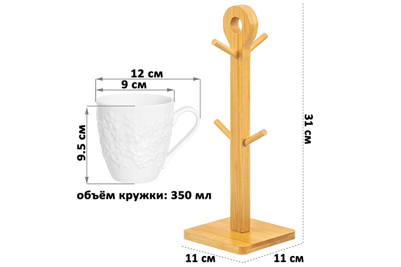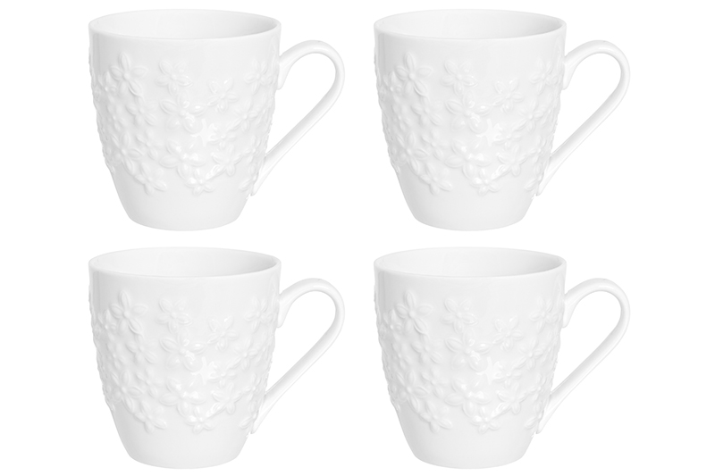 Набор состоит из 4-х кружек серии «Цветочки» объемом по 350 мл на деревянной подставке. Кружки выполнены из высококачественного фарфора и украшены рельефными узорами. Подходят для любых напитков: чая, кофе, лимонада или сока. Фарфоровые кружки не впитывают цвет напитков и долгое время будут выглядеть, как новые! Деревянная подставка имеет ручку, с помощью которой набор удобно переносить. Набор из подставки с кружками имеет размер 20х20х31 см. Кружки можно использовать в микроволновой печи и посудомоечной машине. Подставку нельзя использовать в посудомоечной машине. Набор поставляется в яркой картонной упаковке. Набор кружек из серии посуды «Цветочки» сможет стать настоящим украшением кухни или приятным подарком для ваших родных и близких!