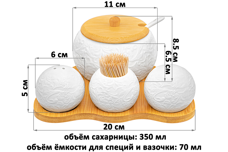 Набор Elan Gallery серии "Лоза" состоит из сахарницы объёмом 350 мл, двух ёмкостей для специй, вазочки под зубочистки на бамбуковой подставке. Общий размер набора – 20х17х9 см. Сахарница 11х11х8,5 см имеет крышку из бамбука (высота изделия без крышки – 6,5 см) и фарфоровую ложку. Баночка с ложечкой подойдёт не только для хранения сахара, но и мёда, варенья или джема. Размеры солонки, перечницы и вазочки под зубочистки: 6х6х5 см каждая (объём по 70 мл). Посуда выполнена из белого фарфора и натурального бамбука. К набору прилагается комплект зубочисток. Сахарница и ёмкости для сервировки имеют рельефный узор и станут украшением вашего стола как в будни, так и на праздник. Баночки для специй круглой формы внизу имеют отверстия для наполнения, которые закрываются пробками. В них можно насыпать соль, перец или любые приправы. Фарфоровые детали без бамбуковых крышки и подставки можно использовать в микроволновой печи и посудомоечной машине. Изделия из бамбука нельзя замачивать! Столовый набор поставляется в стильной картонной упаковке. Сахарница, набор для специй и вазочка под зубочистки из серии посуды "Лоза" станут настоящим украшением любой кухни или приятным подарком для ваших близких!