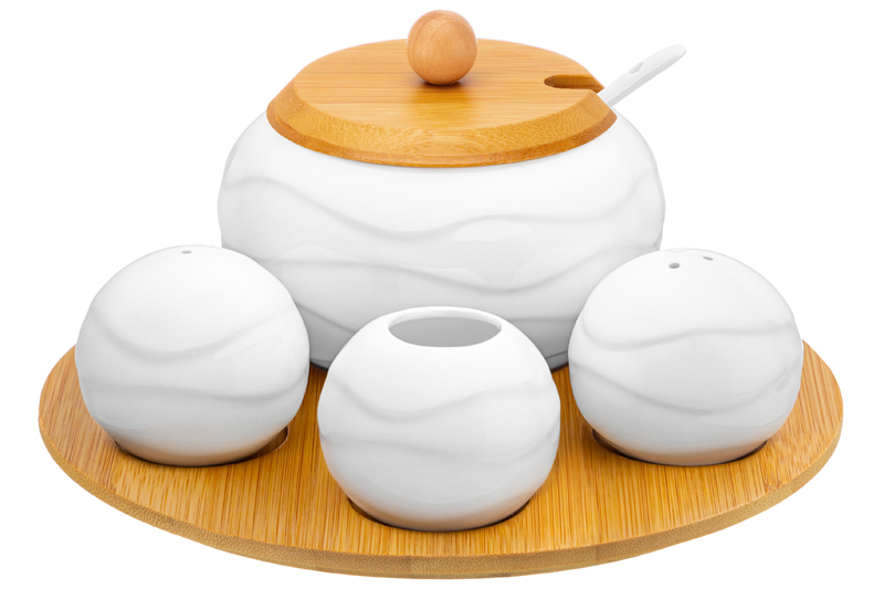 Набор серии "Айсберг волны" состоит из сахарницы на 310 мл с фарфоровой ложкой, вазочки под зубочистки, солонки и перечницы на деревянной подставке. Размер комплекта 20,5х20,5х10 см. Баночки выполнены из высококачественного фарфора и натурального бамбука. Предметы украшены рельефными узорами, что добавит изысканности вашему столу. Емкости для специй снизу имеют отверстия для наполнения, которые закрываются пластиковыми пробками. Уникальный набор посуды станет прекрасным дополнением к вашему столу и подойдет к любому интерьеру кухни, столовой или гостиной. Используйте набор для хранения сахара, соли, перца, любых специй и приправ. Каждая баночка будет выполнять свою функцию и сделает прием пищи удобным. Сахарница подойдет не только для хранения сахара, вы можете использовать ее для меда, варенья, орешков или любых сыпучих продуктов. Фарфоровые детали набора можно мыть в посудомоечной машине. Бамбуковые детали нельзя замачивать. Набор поставляется в яркой картонной упаковке. Баночки станут чудесным подарком для близких и друзей. Подарите посуду маме, бабушке, подруге, сестре, или украсьте свою кухню стильным и функциональным аксессуаром. Набор посуды серии "Айсберг волны" станет украшением вашей кухни и поможет создать на ней уют.