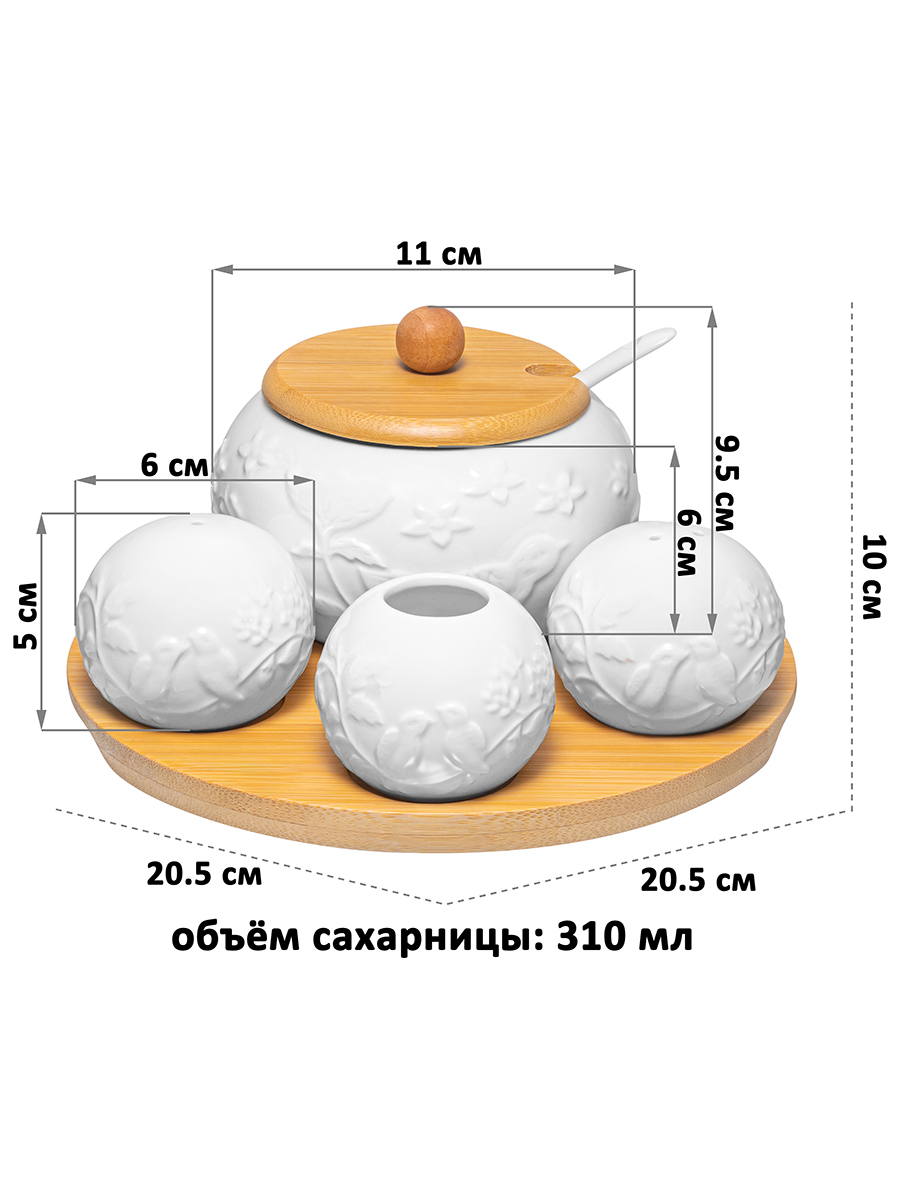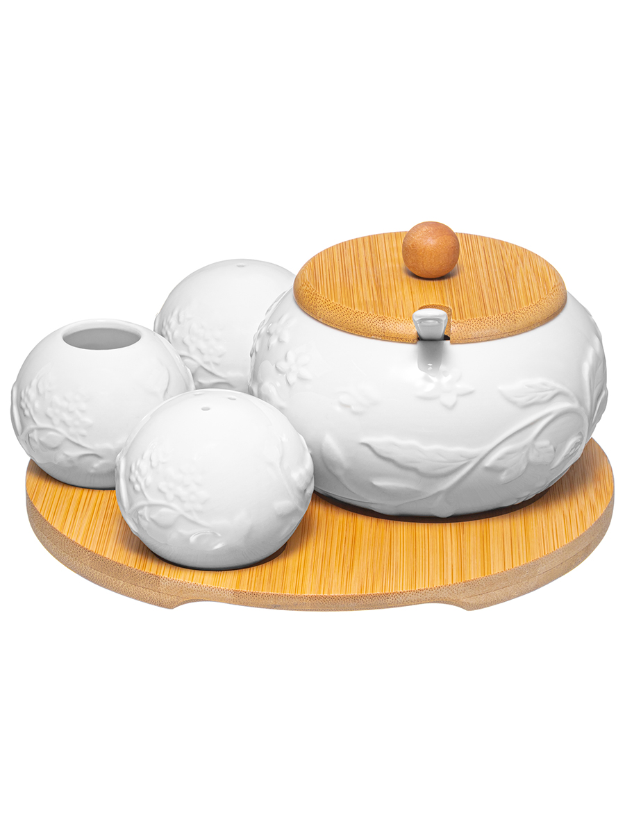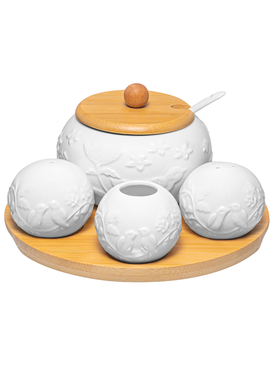 Набор посуды на деревянной подставке из серии «Птички на ветке» от Elan Gallery предназначен для эстетичной сервировки вашего стола. Включает в себя сахарницу с ложкой, вазочку под зубочистки и набор для специй. Выполнены из высококачественного белого фарфора. Он не впитывает цвет продуктов и легко отмывается, благодаря чему надолго сохраняет свою белизну. Подставка и крышка сахарницы выполнены из натурального бамбука. Размер подставки – 20,5х20,5х1 см. комплект станет воплощением прекрасного вкуса. Поверхность изделий украшает рельефный рисунок в виде лиственных веточек, на которых сидят птички. Размер сахарницы – 11х11х9,5 см, объём – 310 мл. Подойдёт для сахара, соли, а также для специй и приправ. Засыпьте внутрь чай или кофе, чтобы в любой момент заварить свежий напиток. Эстетичную ёмкость также можно приспособить под варенье, мёд или икру. Ложечка размером 13х2,5 см позволит удобно набрать необходимое количество продуктов. Она компактно помещается в баночке благодаря выемке на крышке. Такое изделие отлично дополнит сервировку стола как для сытного завтрака, так и для уютного чаепития. Размер каждой маленькой ёмкости – 6х6х5 см, объём – 75 мл. Набор для специй позволит держать под рукой необходимые приправы. Наполняются через отверстие снизу и закрываются пластиковой пробкой. Вазочка для зубочисток станет удобной гигиенической принадлежностью. Зубочистки не входят в комплект. Не рекомендуется применять абразивные моющие средства. Без бамбуковых и пластиковых элементов подходят для использования в посудомоечной машине и микроволновой печи. Бамбук нельзя замачивать! Поставляются в дизайнерской картонной коробке – благодаря ей вам не потребуется дополнительная подарочная упаковка. Фарфоровая сервировочная посуда будет оригинальным подарком для хозяйки, ценящей не только практичность, но и привлекательность. Серия «Птички на ветке» от бренда Элан Галерея станет украшением любого кухонного инвентаря и позволит собрать красивый сервиз в едином стиле!