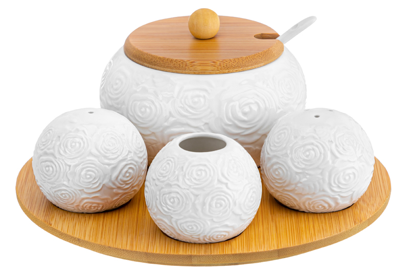 Набор серии "Розы" состоит из сахарницы на 310 мл с фарфоровой ложкой, вазочки под зубочистки, солонки и перечницы на деревянной подставке. Размер комплекта 20,5х20,5х10 см. Баночки выполнены из высококачественного фарфора и натурального бамбука. Предметы украшены рельефными узорами, что добавит изысканности вашему столу. Емкости для специй снизу имеют отверстия для наполнения, которые закрываются пластиковыми пробками. Уникальный набор посуды станет прекрасным дополнением к вашему столу и подойдет к любому интерьеру кухни, столовой или гостиной. Используйте набор для хранения сахара, соли, перца, любых специй и приправ. Каждая баночка будет выполнять свою функцию и сделает прием пищи удобным. Сахарница подойдет не только для хранения сахара, вы можете использовать ее для меда, варенья, орешков или любых сыпучих продуктов. Фарфоровые детали набора можно мыть в посудомоечной машине. Бамбуковые детали нельзя замачивать. Набор поставляется в яркой картонной упаковке. Баночки станут чудесным подарком для близких и друзей. Подарите посуду маме, бабушке, подруге, сестре, или украсьте свою кухню стильным и функциональным аксессуаром. Набор посуды серии "Розы" станет украшением вашей кухни и поможет создать на ней уют.