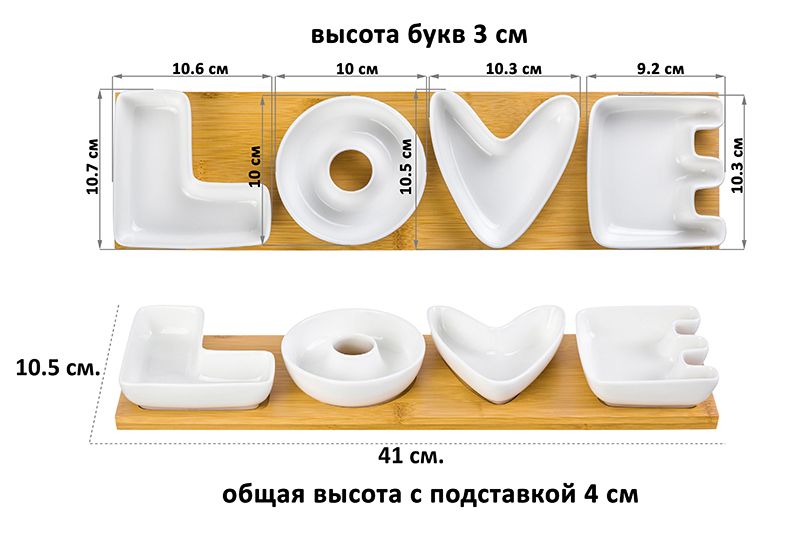 Набор из четырех сервировочных блюд «LOVE» выполнен из высококачественного фарфора, состоит из четырех сервировочных блюд и деревянной доски подставки. Объем каждого блюда 100 мл. Блюдо прекрасно подходит для сервировки орешков, закусок, оливок, сладостей и благодаря необычному дизайну украсит любой стол. Секции можно использовать и по отдельности. В серии фарфоровой посуды с использованием бамбука представлен широкий ассортимент товаров для сервировки стола, которые, несомненно, впишутся в любой интерьер благодаря лаконичному дизайну, натуральным материалам и высокой функциональности. Такому подарку будет рада любая хозяйка!