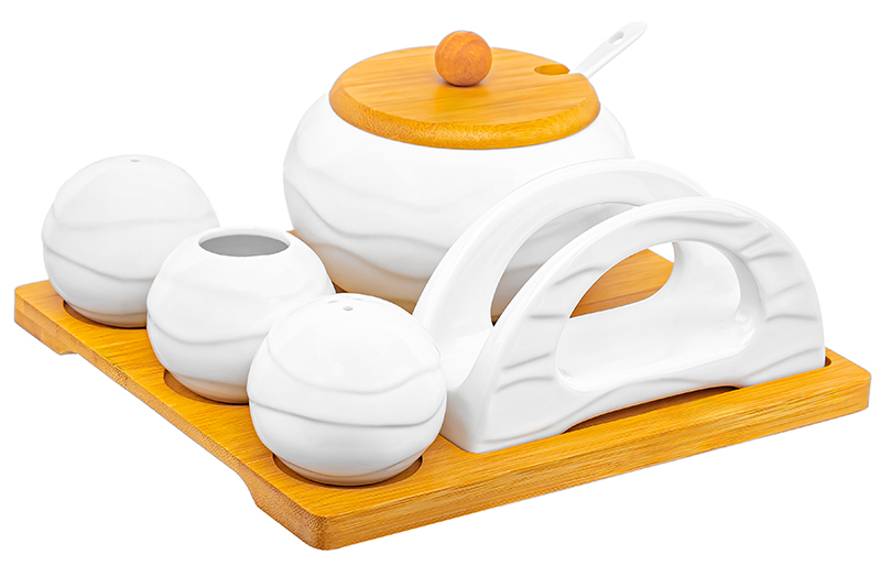 Сервировочный набор из серии «Айсберг волны» от Elan Gallery предназначен для красивой подачи на стол специй и сыпучих продуктов. Состоит из сахарницы с ложкой, двух баночек для специй, подставки для зубочисток (в комплект не входят) и салфетницы. Общий размер набора – 20,5х20,5х8,5 см. Размер сахарницы – 11x11x8,5 см, объём – 310 мл, длина ложечки – 13 см. Размер маленьких ёмкостей – 6х6х5 см, объём – 75 мл. Размер салфетницы – 13,5х4,5х7 см. Изделия выполнены из высококачественного белого фарфора. Он не впитывает цвет продуктов и легко отмывается, благодаря чему надолго сохранит свою белизну. Поверхность изделий украшают рельефные узоры в виде поперечных волн. Крышка сахарницы и подставка выполнены из натурального бамбука. Набор гармонично дополнит сервировку любого стола. Контейнеры подойдут для хранения сыпучих продуктов. Эстетичную сахарницу также можно приспособить под варенье, мёд или икру. Вы с лёгкостью наберёте необходимое количество продукта с помощью ложечки, которая компактно помещается в баночку благодаря выемке на крышке. Отлично послужит в качестве медовницы и станет альтернативой традиционным медовым горшочкам и бочонкам! Заполните маленькие ёмкости специями и приправами, чтобы во время приготовления еды всё необходимое было под рукой. Наполняются через отверстия снизу и закрываются пластиковыми пробками. Салфетница и подставка под зубочистки помогут вам хранить средства гигиены, необходимые во время приёма пищи. Не рекомендуется применять абразивные моющие средства. Без бамбуковых и пластиковых элементов изделия подходят для использования в посудомоечной машине и микроволновой печи. Бамбук нельзя замачивать! Поставляется в дизайнерской картонной упаковке. Фарфоровая сервировочная посуда послужит оригинальным подарком для хозяйки, ценящей не только практичность, но и привлекательность. Серия «Айсберг волны» станет украшением любого кухонного инвентаря и позволит собрать сервиз в едином стиле!