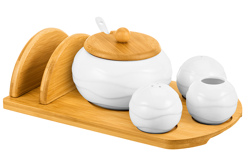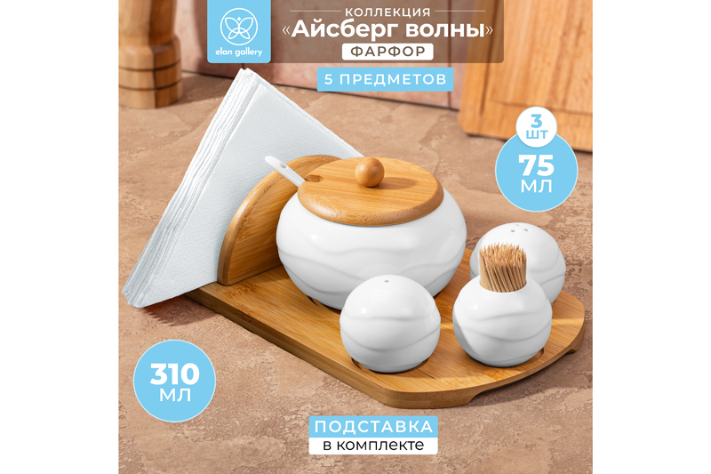 Набор посуды от Elan Gallery из серии «Айсберг волны» на бамбуковой подставке предназначен для эстетичной сервировки вашего стола. Включает в себя сахарницу с ложкой, набор для специй, вазочку под зубочистки и бамбуковую подставку с отсеком для салфеток. Набор выполнен из белого фарфора с бамбуковыми элементами. Размер сахарницы – 11х11х8,5 см, объём – 310 мл. Размер каждой маленькой ёмкости – 6х6х5 см, объём – 75 мл. Зубочистки не входят в комплект. Размер встроенной в подставку салфетницы 13,5х5х7 см. Фарфоровые изделия не впитывают цвет продуктов и легко отмывается, благодаря чему надолго сохраняет свою белизну. Поверхность изделий украшают рельефные узоры. Подставка и крышка сахарницы выполнены из натурального бамбука. Подайте комплект на стол вместе с горячими блюдами, чтобы каждый мог приправить пищу по своему вкусу. Эстетичную ёмкость можно приспособить под варенье, мёд или икру. Маленькая ложечка позволит удобно набрать необходимое количество продуктов. Она компактно помещается в баночке благодаря выемке на крышке. Такое изделие отлично дополнит сервировку стола как для сытного завтрака, так и для уютного чаепития. Набор для специй позволит держать под рукой соль и необходимые приправы. Баночки наполняются через отверстие снизу и закрываются пластиковой пробкой. Вазочка для зубочисток станет удобной гигиенической принадлежностью. Не рекомендуется применять абразивные моющие средства. Без бамбуковых элементов ёмкости подходят для использования в микроволновой печи и посудомоечной машине. Поставляются в дизайнерской картонной коробке – благодаря ей вам не потребуется дополнительная подарочная упаковка. Фарфоровая сервировочная посуда будет оригинальным подарком для хозяйки, ценящей не только практичность, но и привлекательность. Серия «Айсберг волны» от бренда Элан Галерея пополнит вашу коллекцию кухонного инвентаря и позволит собрать красивый сервиз в едином стиле!