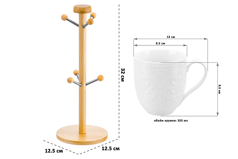 Набор 6 кружек 320 мл 12*8,5*9,5 см "Жемчуг" на дерев. подставке 12,5*12,5*32 см
