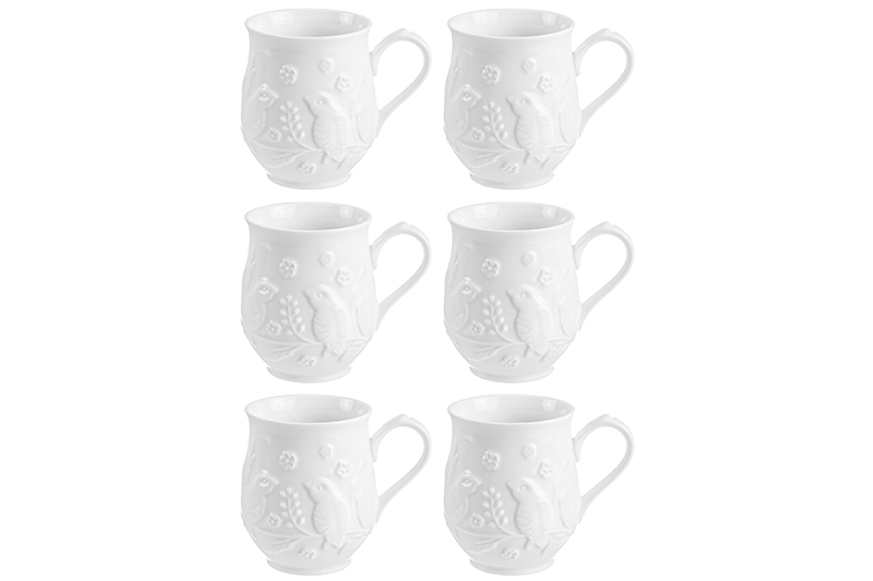 Набор серии "Птички на ветке" состоит из 6-ти кружек по 350 мл на бамбуковой подставке 16,3х16,3х34,5 см. Набор кружек поможет провести множество приятных завтраков с капучино или латте, а также уютных чайных вечеров. Кружки выполнены из высококачественного белого фарфора и украшены декоративными рельефными узорами. Фарфоровые чашки отличаются от керамических повышенной плотностью. Они не впитывают цвет кофе, чая, глинтвейна, других горячих напитков и не деформируются от влаги, чему может быть подвержена керамика. Кружки можно использовать в СВЧ и ПММ. Подставку из бамбука нельзя замачивать и мыть в ПММ. Комплект поставляется в стильной картонной упаковке. Красивые кружки из серии посуды "Птички на ветке" смогут стать настоящим украшением кухни у вас дома или приятным подарком для ваших родных и близких!