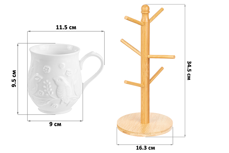 Набор 6 кружек 350 мл "Птички на ветке" на бамбуковой подставке 16,3*16,3*34,5 см, бочонок