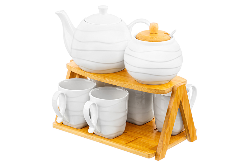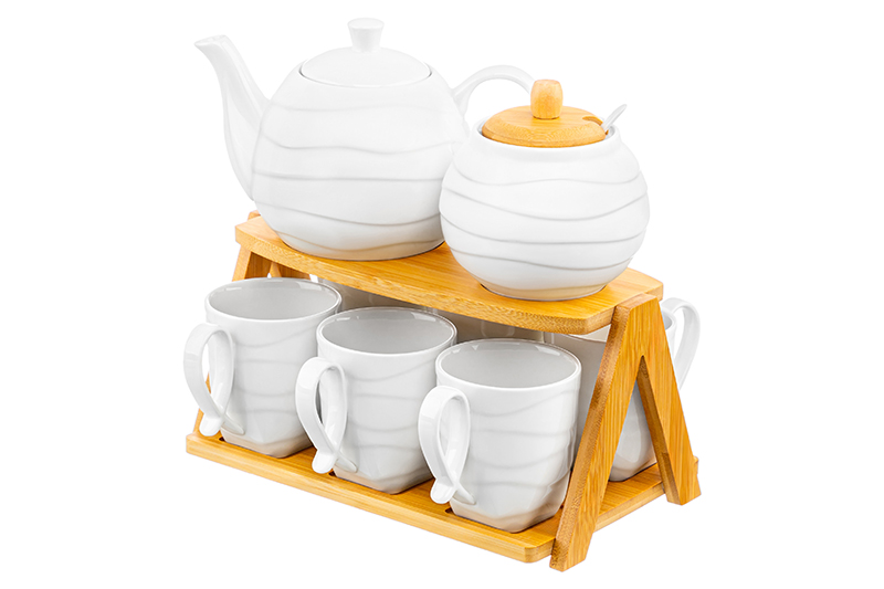 Набор - чайник + сахарница + 6 кружек "Айсберг волны" на бамбуковой подставке
