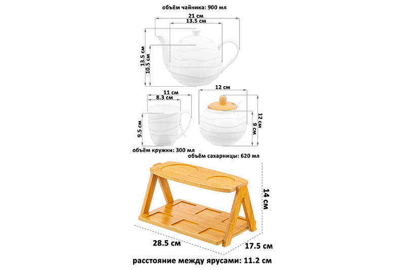 Набор Elan Gallery "Айсберг волны" на бамбуковой подставке выполнен из белого фарфора. Этот комплект станет воплощением прекрасного вкуса и поможет создать уют в вашем доме. В состав набора входят: чайник заварочный объёмом 900 мл, сахарница 620 мл с бамбуковой крышкой и фарфоровой ложкой, шесть кружек с изящными ручками в виде петельки. Объём каждого бокала – 300 мл. Чайный набор рассчитан на 6 персон. Сахарницу можно использовать как баночку с крышкой для меда, варенья, специй, орешков, цукатов или икры. Чайник оснащен фильтром в виде маленьких отверстий в стеночке, благодаря которому вы сможете наслаждаться ароматной заваркой без попадания мелких чаинок. На фарфоровой крышке с обратной стороны есть небольшой выступ, чтобы она хорошо держалась на чайнике. Праздничный набор подходит для любителей чёрного, зелёного, травяного чая. Вы сможете насладиться своими любимыми напитками из этих прекрасных классических чашек и удивить своих гостей красивой сервировкой стола как в будни, так и на праздник. Не рекомендуется применять абразивные моющие средства. Без бамбуковых деталей можно использовать в микроволновой печи и посудомоечной машине. Бамбук нельзя замачивать! Поставляется в стильной картонной упаковке. Подарите сервиз из фарфора с бамбуковыми деталями маме, бабушке, подруге, коллеге или сестре. Его красивый дизайн и функциональность понравятся каждому, а высокое качество фарфора и бамбука обеспечат долговечность этого подарка.