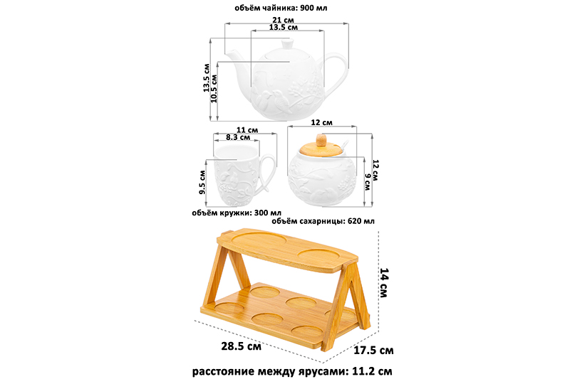 Набор Elan Gallery "Птички на ветке" на бамбуковой подставке выполнен из белого фарфора. Этот комплект станет воплощением прекрасного вкуса и поможет создать уют в вашем доме. В состав набора входят: чайник заварочный объёмом 900 мл, сахарница 620 мл с бамбуковой крышкой и фарфоровой ложкой, шесть кружек с изящными ручками в виде петельки. Объём каждого бокала – 300 мл. Чайный набор рассчитан на 6 персон. Сахарницу можно использовать как баночку с крышкой для меда, варенья, специй, орешков, цукатов или икры. Чайник оснащен фильтром в виде маленьких отверстий в стеночке, благодаря которому вы сможете наслаждаться ароматной заваркой без попадания мелких чаинок. На фарфоровой крышке с обратной стороны есть небольшой выступ, чтобы она хорошо держалась на чайнике. Праздничный набор подходит для любителей чёрного, зелёного или травяного чая. Вы сможете насладиться своими любимыми напитками из этих прекрасных классических чашек и удивить своих гостей красивой сервировкой стола как в будни, так и на праздник. Не рекомендуется применять абразивные моющие средства. Без бамбуковых деталей можно использовать в микроволновой печи и посудомоечной машине. Бамбук нельзя замачивать! Поставляется в стильной картонной упаковке. Подарите сервиз из фарфора с бамбуковыми деталями маме, бабушке, подруге, коллеге или сестре. Его красивый дизайн и функциональность понравятся каждому, а высокое качество фарфора и бамбука обеспечат долговечность этого подарка.