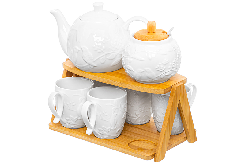 Набор - чайник + сахарница + 6 кружек "Птички на ветке" на бамбуковой подставке