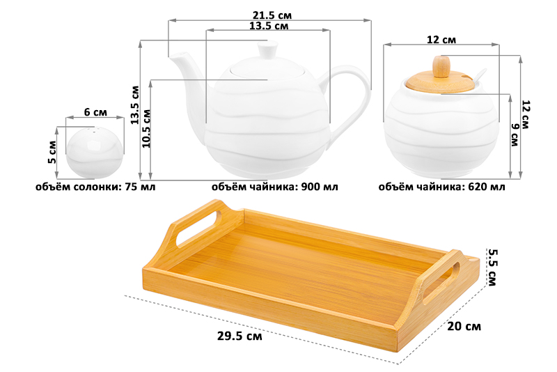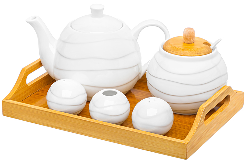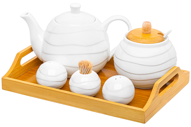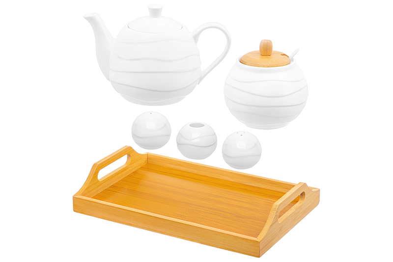 Набор посуды на бамбуковой подставке из серии «Айсберг волны» предназначен для эстетичной сервировки вашего стола. Общий размер изделия – 29,5х20х5,5 см. Включает в себя чайник, сахарницу с ложкой, набор для специй и вазочку под зубочистки. Посуда выполнена из фарфора с элементами из бамбука. Фарфор не впитывает цвет напитков и легко отмывается, а потому надолго сохранит свою белизну. Комплект станет воплощением прекрасного вкуса и поможет создать уют в вашем доме. Благодаря удобным ручкам бамбукового подноса набор легко переносить между комнатами. Размер чайника – 21,5х13,5х13,5 см, объём – 900 мл. Подходит для ежедневного заваривания и станет незаменимым элементом организации любого чаепития. Фильтр в виде маленьких отверстий в стеночке позволит наслаждаться ароматной заваркой без попадания мелких чаинок. С обратной стороны крышечки имеется язычок, благодаря которому она хорошо держится на заварнике. Размер сахарницы – 12х12х12 см, объём – 620 мл. Подойдёт для сахара и соли, специй, приправ и других сыпучих продуктов. Ёмкость с крышечкой можно приспособить под варенье, мёд или икру. Ложечка компактно помещается в сахарнице благодаря выемке на крышке. Набор для специй поможет держать под рукой необходимые приправы, соль и перец. Наполняются через отверстие снизу и закрываются пластиковой пробкой. Вазочка для зубочисток станет удобной гигиенической принадлежностью. Размер каждого изделия – 6х6х5 см, объём – 75 мл. Не рекомендуется применять абразивные моющие средства. Фарфоровые изделия без бамбуковых элементов подходят для использования в микроволновой печи и посудомоечной машине. Поставляется в дизайнерской картонной коробке – благодаря ей вам не потребуется дополнительная подарочная упаковка. Фарфоровая сервировочная посуда станет оригинальным подарком для хозяйки, ценящей не только практичность, но и привлекательность. Серия «Айсберг волны» станет украшением любого кухонного инвентаря и позволит собрать сервиз в едином стиле!