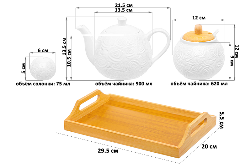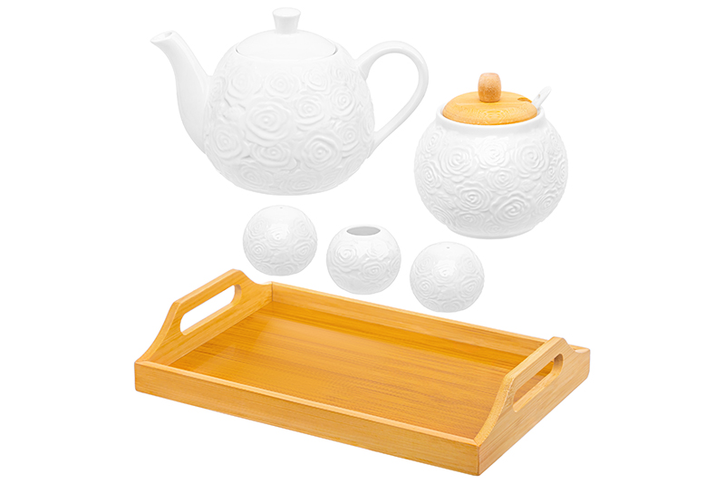 Набор Elan Gallery "Розы" на бамбуковой подставке с ручками выполнен из белого фарфора. Этот комплект станет воплощением прекрасного вкуса и поможет создать уют в вашем доме. Благодаря удобным ручкам на подносе посуду можно переносить из одной комнаты в другую. В состав набора входят: чайник заварочный объёмом 900 мл, сахарница 620 мл с бамбуковой крышкой и фарфоровой ложкой, вазочка под зубочистки и набор для специй (два предмета по 75 мл). Сахарницу можно использовать как баночку с крышкой для меда, варенья, орешков или икры. Чайник оснащен фильтром в виде маленьких отверстий в стеночке, благодаря которому вы сможете наслаждаться ароматной заваркой без попадания мелких чаинок. На фарфоровой крышке с обратной стороны есть небольшой выступ, чтобы она хорошо держалась на чайнике. Праздничный набор подходит для любителей чёрного, зелёного или травяного чая. Вы сможете удивить своих гостей красивой сервировкой стола как в будни, так и на праздник. Благодаря ёмкостям соль, приправы и специи всегда будут под рукой во время приёма или приготовления пищи. Не рекомендуется применять абразивные моющие средства. Без бамбуковых деталей можно использовать в микроволновой печи и посудомоечной машине. Бамбук нельзя замачивать! Сервировочный набор поставляется в стильной картонной упаковке. Подарите чайный комплект с солонкой, перечницей и органайзером под зубочистки своим близким. Его красивый дизайн и функциональность оценит каждая хозяйка, а высокое качество фарфора и бамбука обеспечат долговечность этого подарка.