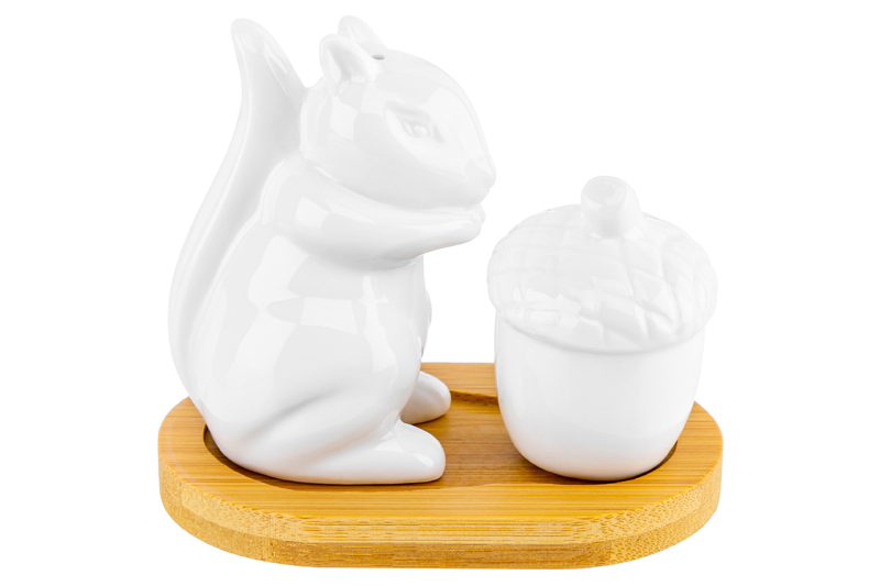 Набор для специй в виде белочки и ореха на деревянной подставке прекрасный пример высококачественной, удобной и лаконичной посуды для изящной сервировки стола. Перечница и солонка выполнены из прочного белого фарфора, а подставка из бамбука. Наполнить емкости для специй можно через отверстие в донышке, которое надежно закрывается пластиковой пробкой. В серии фарфоровой посуды с использованием бамбука представлен широкий ассортимент товаров для сервировки стола, которые, несомненно, впишутся в любой интерьер благодаря лаконичному дизайну, натуральным материалам и высокой функциональности. Такому подарку будет рада любая хозяйка!