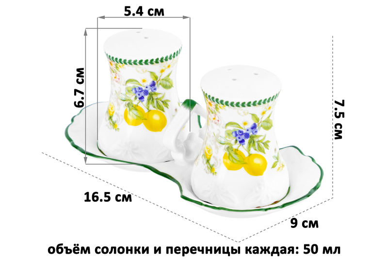 Набор для специй из серии «Лимоны» предназначен для организации хранения продуктов на вашей кухне. Включает в себя перечницу и солонку. Размер каждого изделия – 5,4х5,4х6,7 см, объём – 50 мл. Общий размер набора – 16,5х9х7,5 см. Выполнены из фарфора new bone china, сочетающего в себе изящность и высокую прочность. За счёт гладкости изделия легко отмываются, поэтому долго сохраняют привлекательный вид и практичны в использовании. Плотная структура материала позволяет посуде дольше сохранять температуру блюд и напитков. От других видов костяного фарфора new bone china отличается большей экологичностью в производстве. Фарфоровая посуда с ярким рисунком в виде лимонов станет изящным дополнением интерьера любой кухни или столовой. Ёмкости необычной формы позволят держать под рукой все необходимые во время приготовления еды специи и приправы. Фарфоровые контейнеры наполняются через отверстие снизу и закрываются пластиковой пробкой. Поставляются на фарфоровой подставке: удобная ручка позволит подавать её к столу, а углубления под ёмкости обеспечат их устойчивость при переноске. Не рекомендуется применять абразивные моющие средства. Подходит для использования в посудомоечной машине. Поставляется в красивой картонной коробке – благодаря ей вам не потребуется дополнительная подарочная упаковка. Набор станет оригинальным подарком для любой хозяйки и незаменимым элементом сервировочного инвентаря в вашем доме!