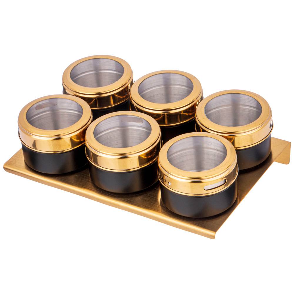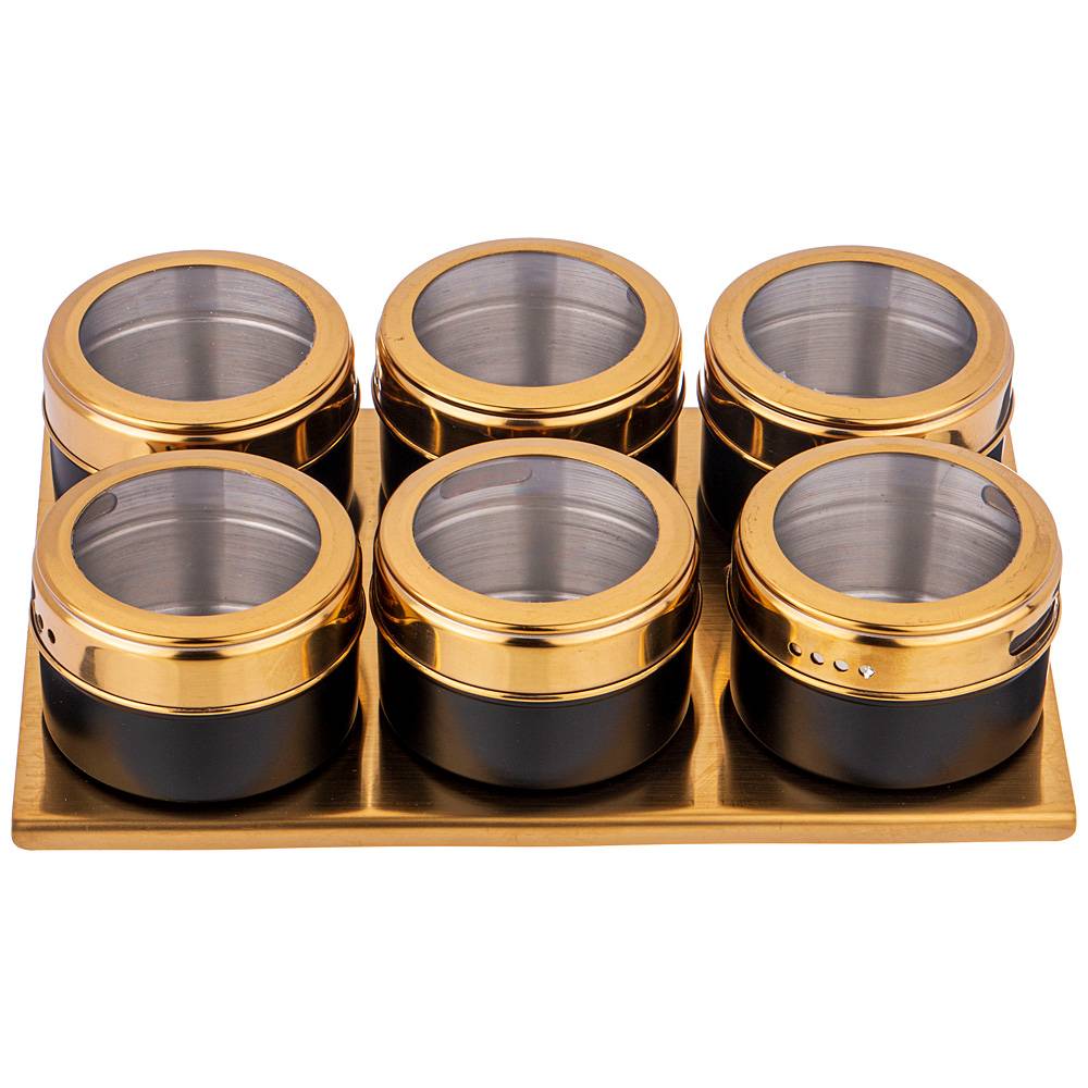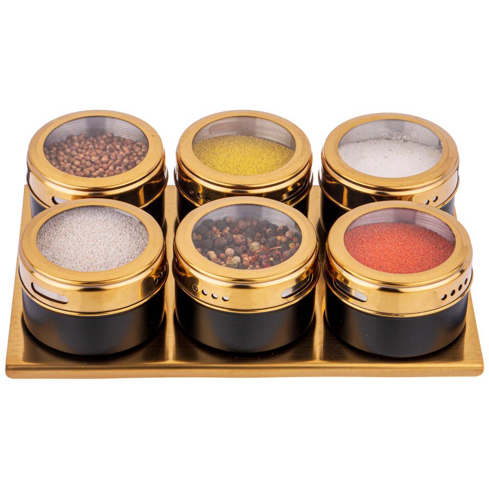 Каждая емкость для специй оснащена магнитом, вмонированным в дно, что позволяет при необходимости закрепить ее на любой другой металлической поверхности, например, дверце холодильника или металлической вытяжке над плитой.