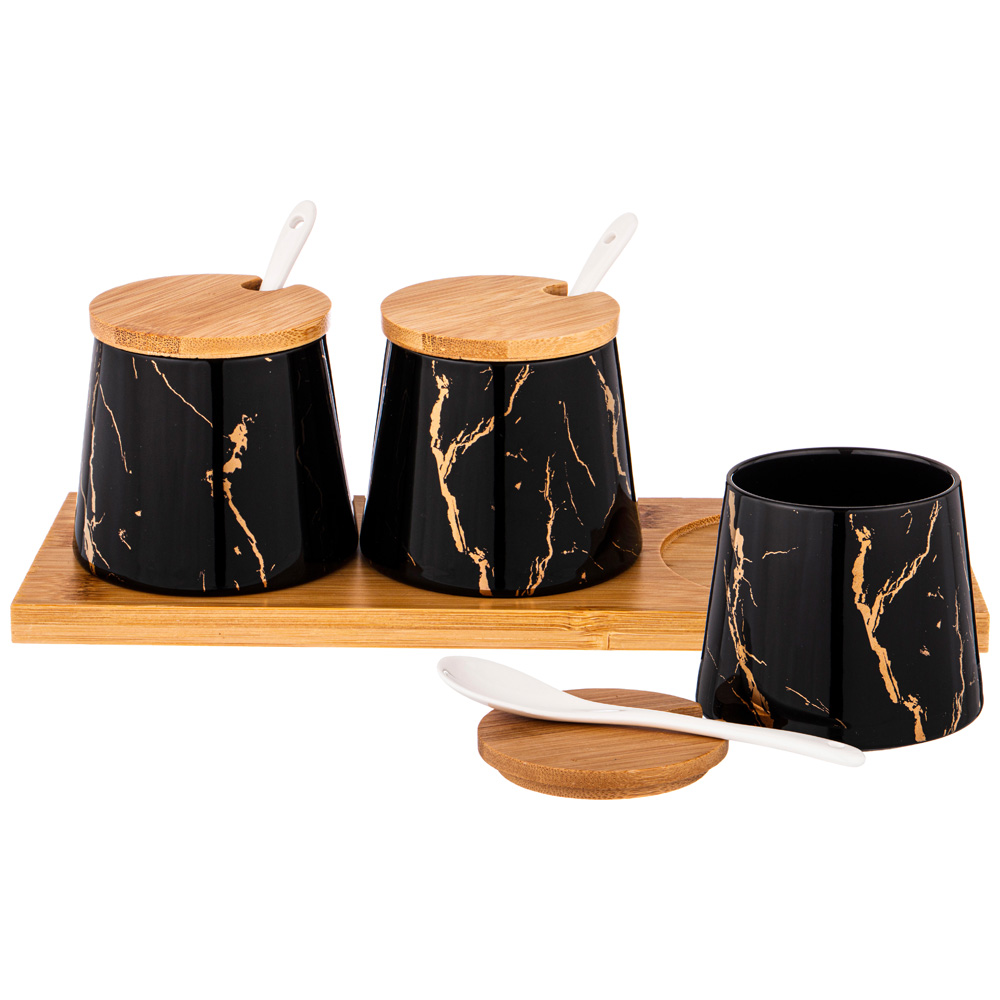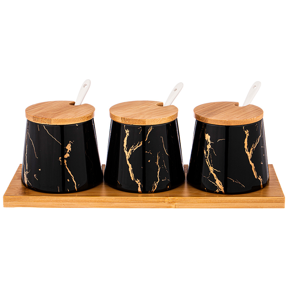 Коллекция "Fantasy" ТМ LEFARD - это модная сервировка стола и стильный кухонный интерьер в классическом черном с золотом цвете. Блюда и формы различных размеров, менажницы на бамбуковых подставках, банки, тарелки и салатники различного назначения, чайники, чайные пары и кружки выполнены из упрочненного фарфора. Четкие линии, сверкающее глянцевое покрытие. Вы и Ваш стол неотразим! Посуда прошла сертификацию. Безопасна для контакта с пищевыми продуктами. Можно использовать в микроволновой печи. Не рекомендуется мыть в посудомоечной машине. Комплектность: банка с крышкой 280 мл - 3 шт, ложка фарфоровая - 3 шт, подставка деревянная 28*10*8,5 см - 1 шт.