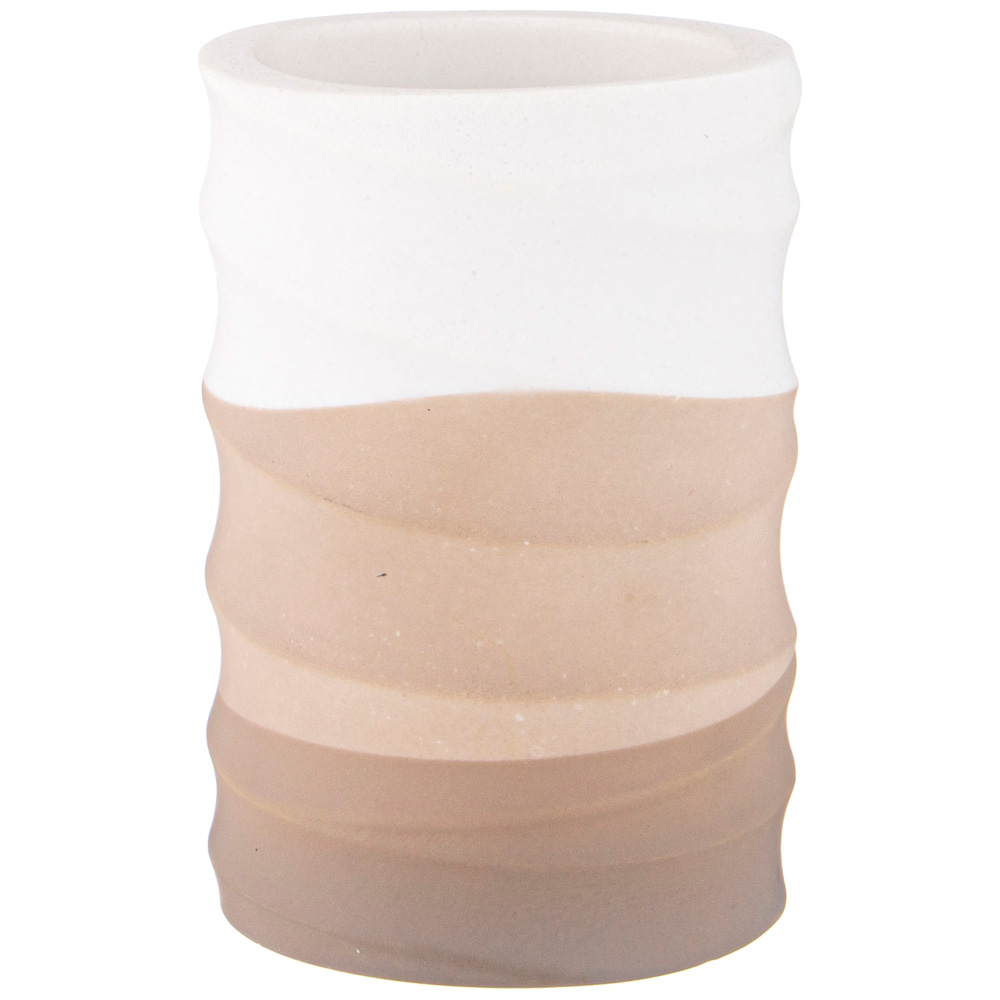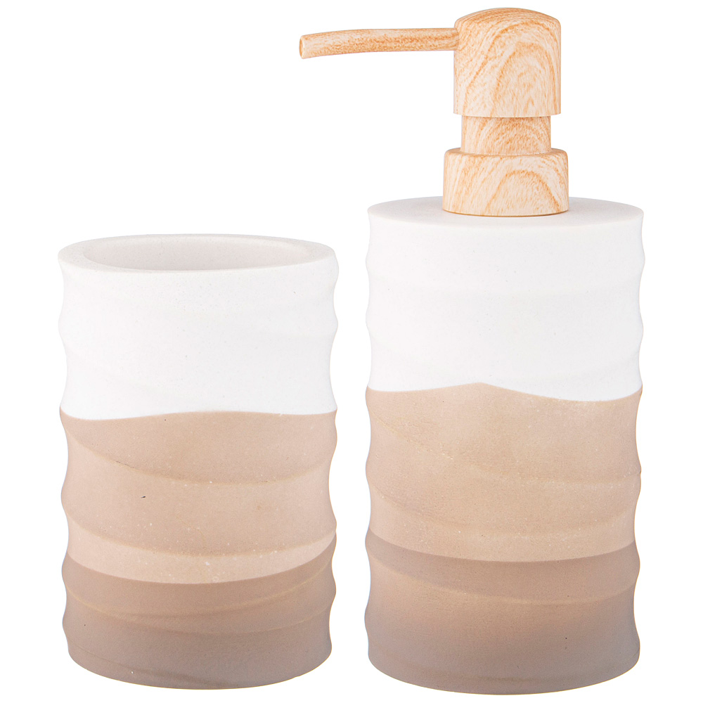 Набор аксессуаров для ванной комнаты состоит из дозатора для жидкого мыла и подставки-стакана.