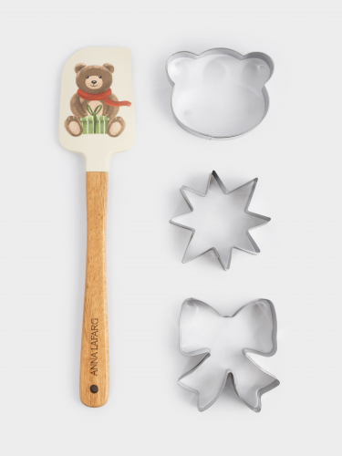 Набор для выпечки, 4 предмета. Комплектация и размеры: лопатка-шпатель, 21 см - 1 шт, формы для печенья - 3 шт, бант - 7,5х6 см, звезда - 7,5х6 см, медведь - 7,5х6 см. Материал: нержавеющая сталь, силикон, дерево акации. Рекомендации по уходу: мыть вручную с применением мягких моющих средств. Не использовать для ухода абразивные чистящие средства и жесткие губки. Формы для печенья можно мыть в посудомоечной машине.